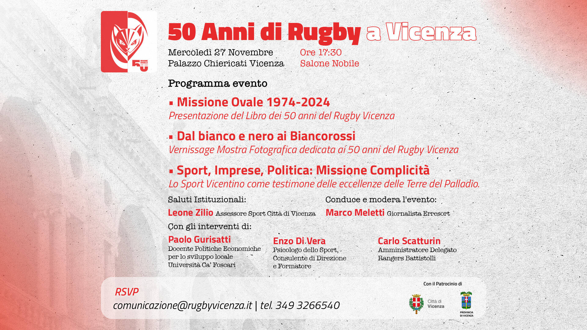50 Anni di Rugby a Vicenza” mercoledì 27 novembre dalle ore 17:30 presso il Salone Nobile di Palazzo Chiericati. Un momento di celebrazione per il rugby vicentino, ma non solo, una riflessione sullo sport come forza unificante e motore di sviluppo locale.