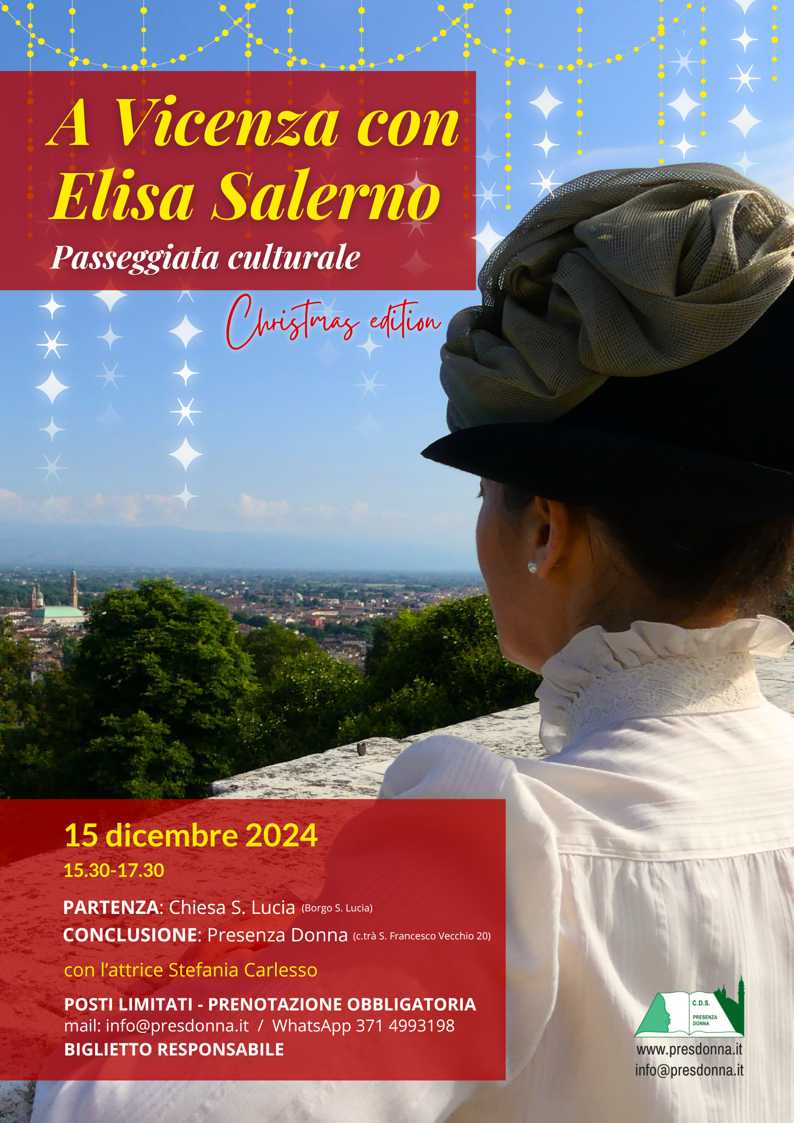 “A Vicenza con Elisa Salerno – Passeggiata culturale” è un'occasione per conoscere la vita e le opere della giornalista e femminista cattolica vicentina, camminando nei luoghi di Vicenza in cui ha vissuto e operato, con tappe animate dalle sue parole ancora vibranti e attuali.