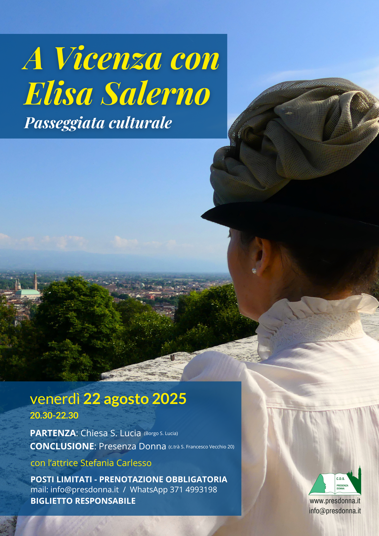 “A Vicenza con Elisa Salerno – Passeggiata culturale” è un'occasione per conoscere la vita e le opere della giornalista e femminista cattolica vicentina, camminando nei luoghi di Vicenza in cui ha vissuto e operato, con tappe animate dalle sue parole ancora vibranti e attuali.