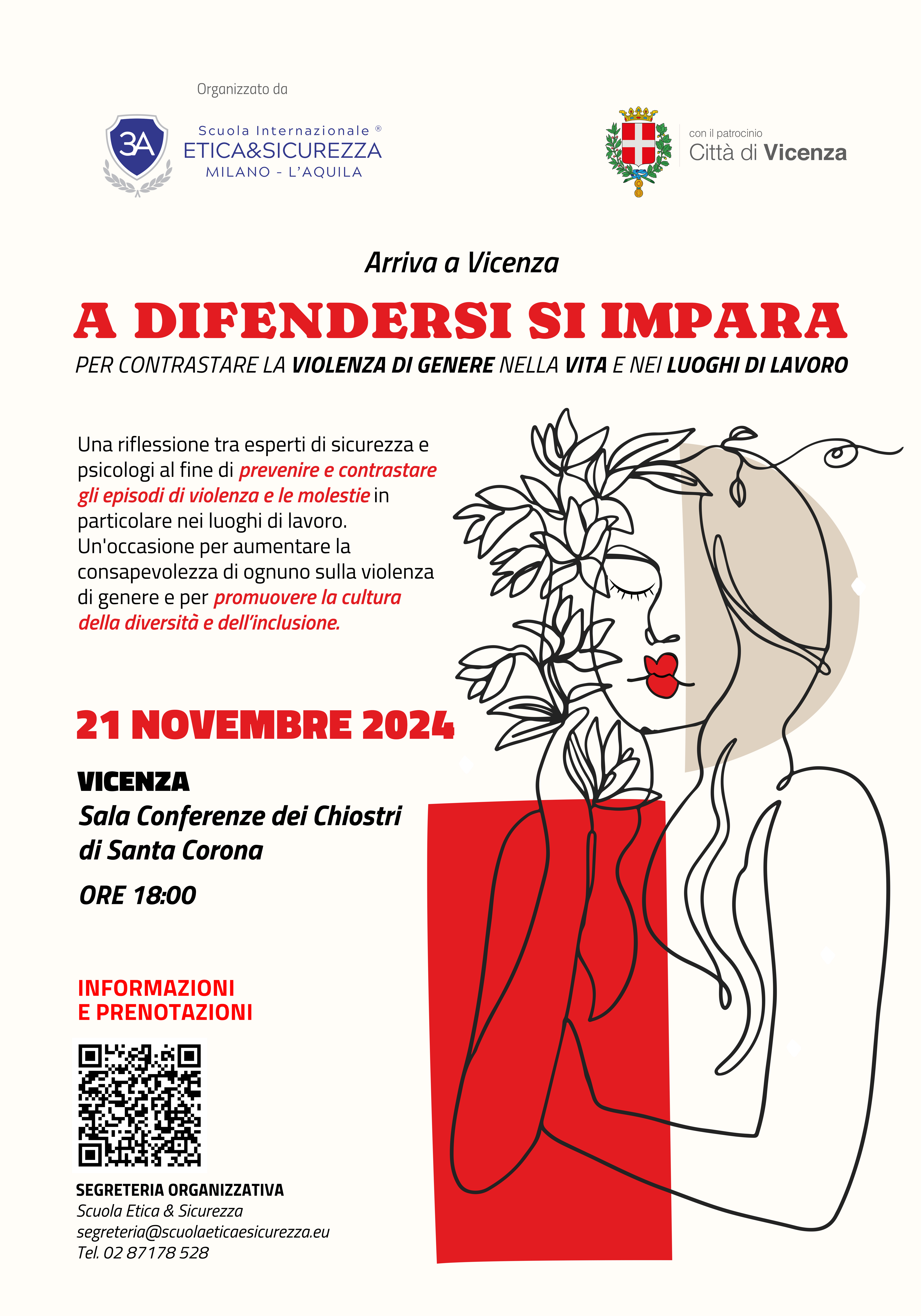 In occasione della Giornata Internazionale contro la Violenza sulle Donne del 25 novembre, si terrà a Vicenza, nella bellissima sala conferenza dei Chiostri di Santa Corona, "A difendersi si impara", nella forma di evento-conferenza, con esperti di sicurezza e psicologi.