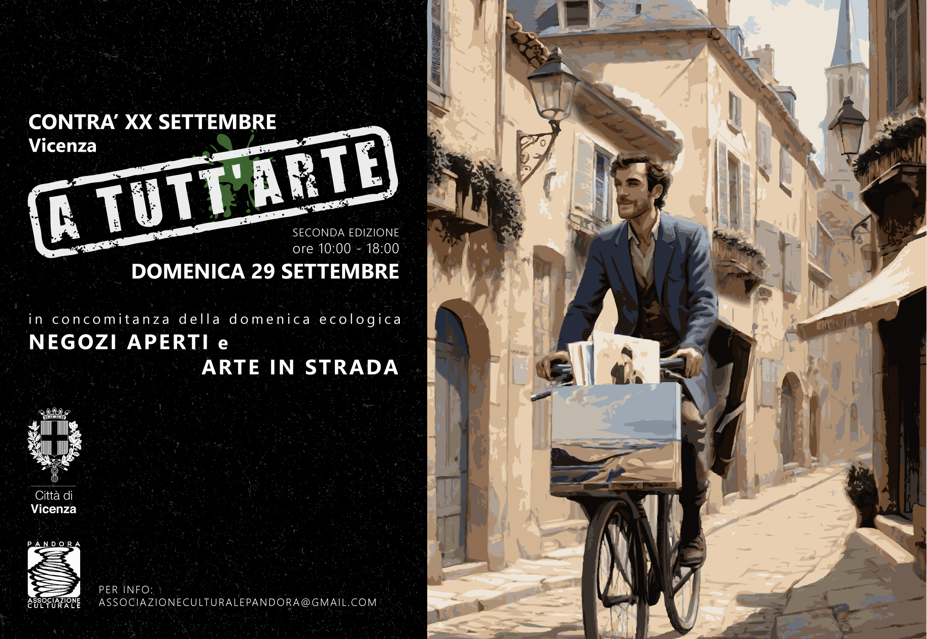 A tutt' Arte domenica 29 settembre dalle 10.00 alle 18.00 in concomitanza della domenica ecologica in tutta contrà XX settembre a Vicenza rassegna d'arte e artigianato delle botteghe di zona, possibilità di mangiare o fare un aperitivo sul luogo che sarà chiuso al traffico veicolare