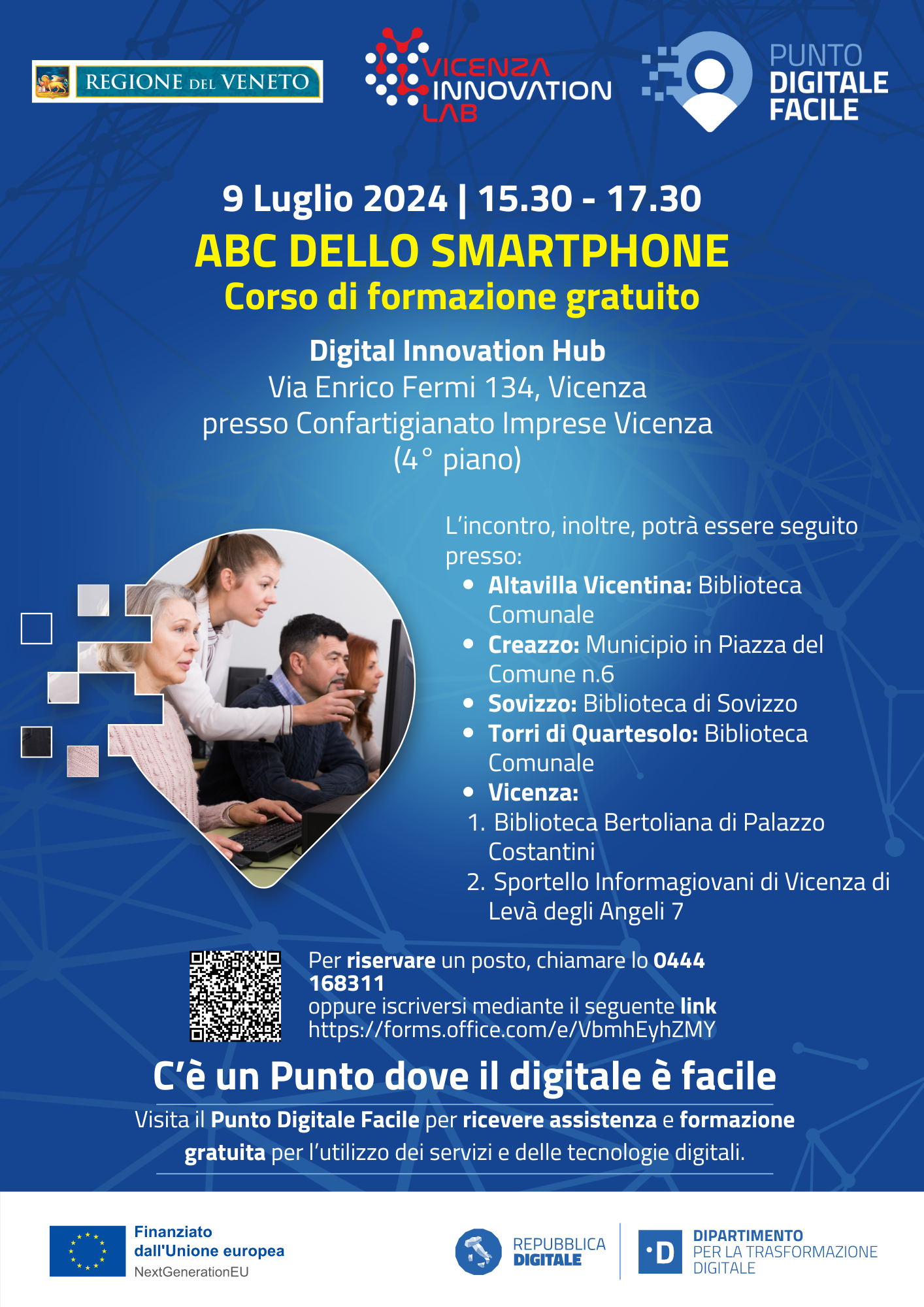 Il Comune di Vicenza, in collaborazione con il Digital Innovation Hub Vicenza e Sherpa, è lieto di annunciare l'evento "ABC dello Smartphone", un corso di formazione gratuito che si terrà il 9 luglio 2024 dalle 15.30 alle 17.30 presso il Digital Innovation Hub, situato in via Enrico Fermi 134 (4° piano), presso Confartigianato Imprese Vicenza.