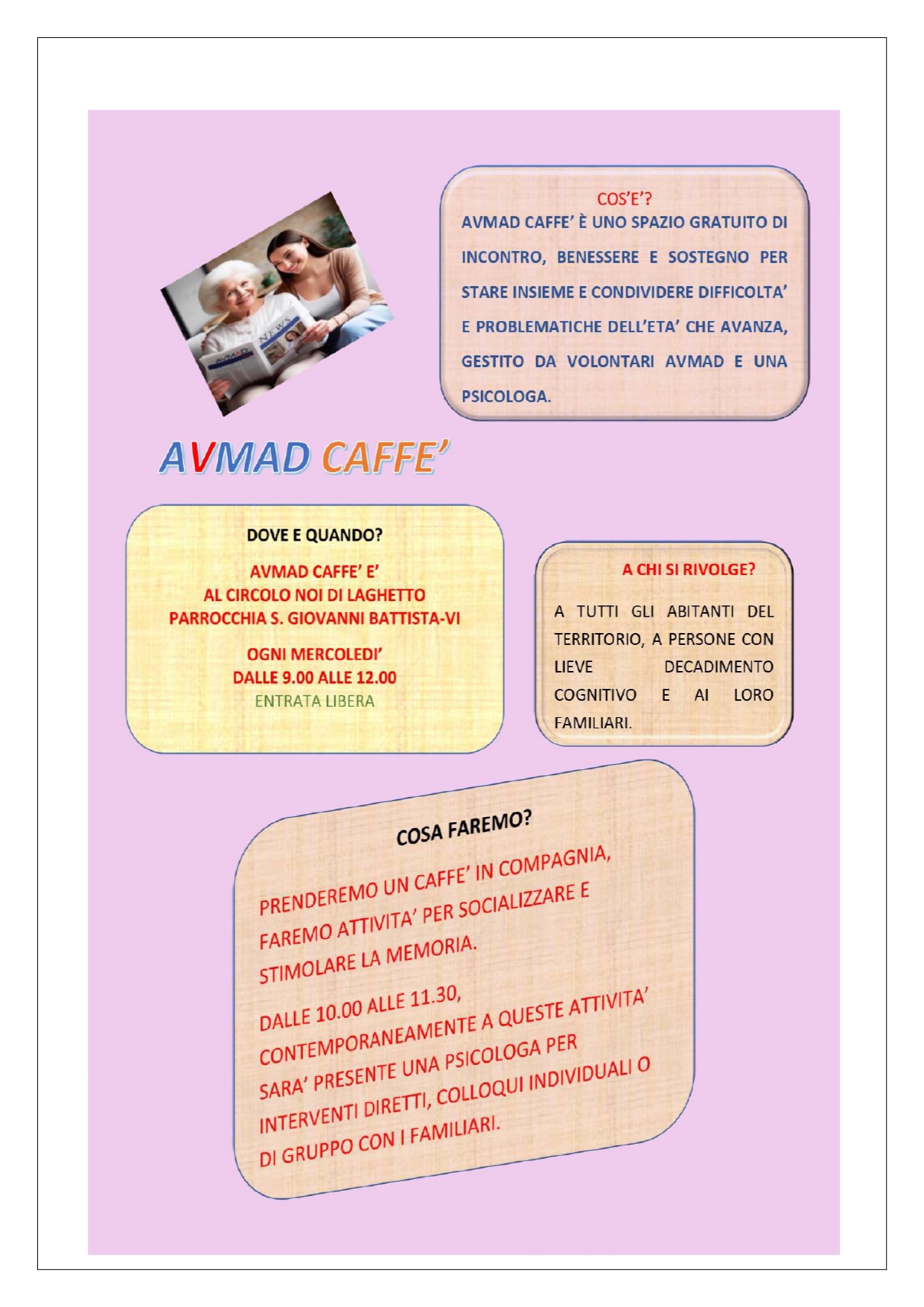 Le attività all'interno di AVMAD Caffè sono varie e coinvolgenti. Vengono proposti giochi per la memoria, lettura dei quotidiani, visione filmati, discussioni, giochi da tavolo, tombola, ecc. AVMAD Caffè è aperto il mercoledì mattina, dalle nove a mezzogiorno, frequentabile con orario libero.