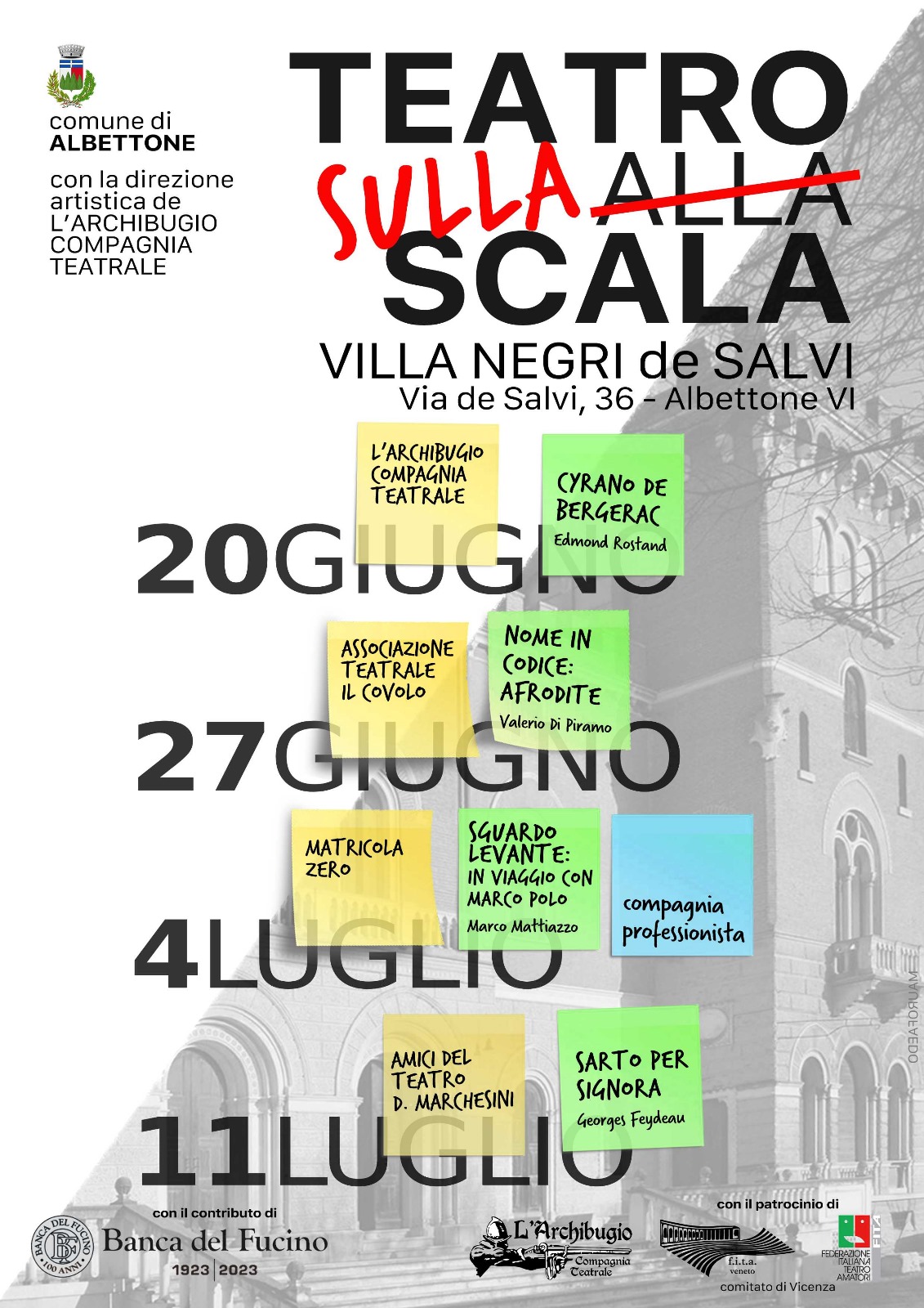 Ultima data per “Teatro sulla scala”, prima edizione della rassegna teatrale promossa dal Comune di Albettone, con la direzione artistica della compagnia leonicena L’Archibugio, il patrocinio di FITA Vicenza e il contributo di Banca del Fucino. I quattro spettacoli in cartellone si sono avvalsi di una prestigiosa location: Villa Negri de Salvi, in Via de Salvi 36, ad Albettone, provincia di Vicenza.