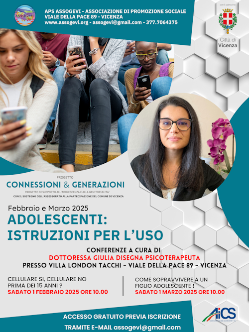 Conferenza rivolta a genitori ed educatori con l'obiettivo è dare informazioni per poter affrontare con maggiore consapevolezze e serenità questo delicato momento della vita dei nostri figli, potendoli capire e supportare nel modo giusto. Verranno toccati, con una modalità di scambio e confronto, diversi temi legati all’adolescenza: cambiamenti, sessualità, problemi scolastici, educazione digitale, cyberbullismo e bullismo.