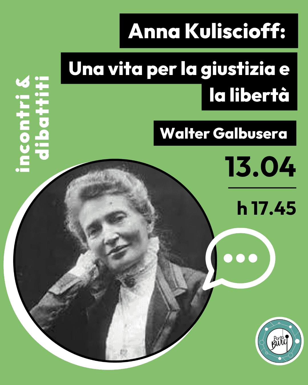 CONVEGNO SULLA FIGURA DI ANNA KULISCIOFF: Rivoluzionaria russa. Anarchica, fuggì in Svizzera e vi conobbe Andrea Costa di cui divenne compagna. Qui, con la figura di Filippo Turati, aderì al marxismo. Compì studi di medicina e in Italia svolse un'intensa attività gratuita di medico dei poveri. Esponente della corrente riformista del Partito socialista, militò nel movimento per l'emancipazione delle donne. Neutralista convinta, dopo la guerra fu rigorosa oppositrice del fascismo.
