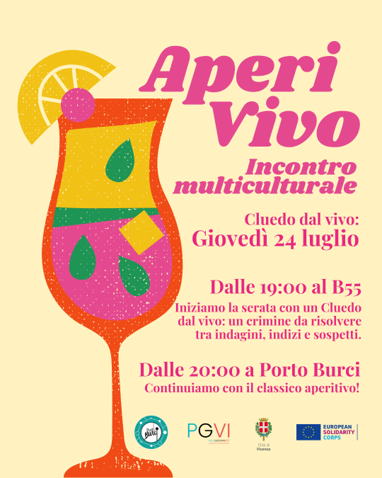 Il tuo incontro multiculturale preferito, AperiVivo, ritorna con un gioco per gli amanti dei gialli: un Cluedo dal vivo! Un crimine da risolvere tra indagini, indizi e sospetti.Una prima parte dalle 19:00, al B55, in cui faremo delle nuove attività per rompere il ghiaccio e il Cluedo dal vivo. Poi, dalle 20.00, ci trasferiremo a Porto Burci per continuare la serata in modo più informale al bancone del Circolo Cosmos per il solito aperitivo!