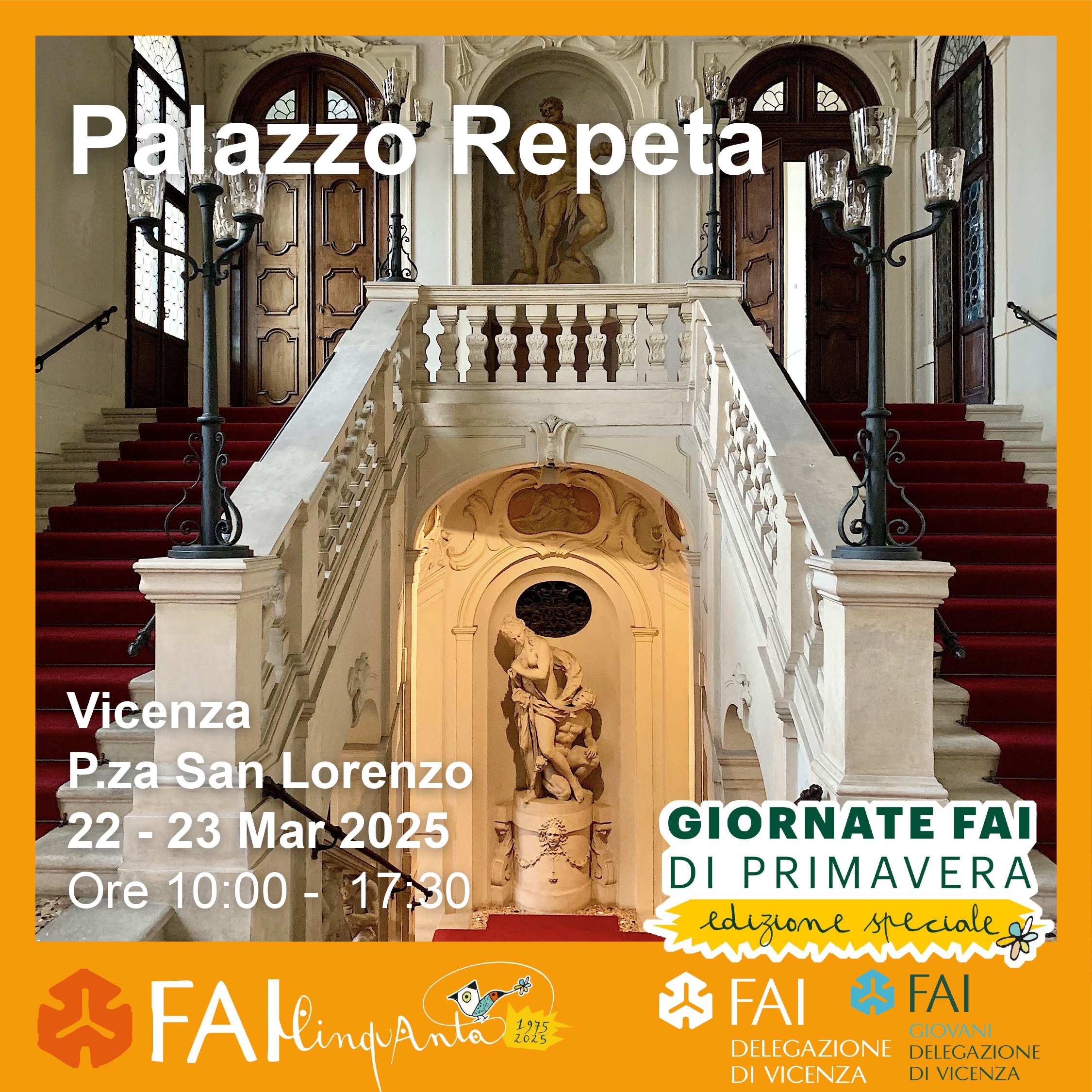 In città la Delegazione FAI di Vicenza aprirà le porte della Loggia detta del Longhena al Giardino Salvi, di proprietà del Comune di Vicenza, e di Palazzo Repeta. sabato 22 e domenica 23 marzo dalle 10 alle 17.30