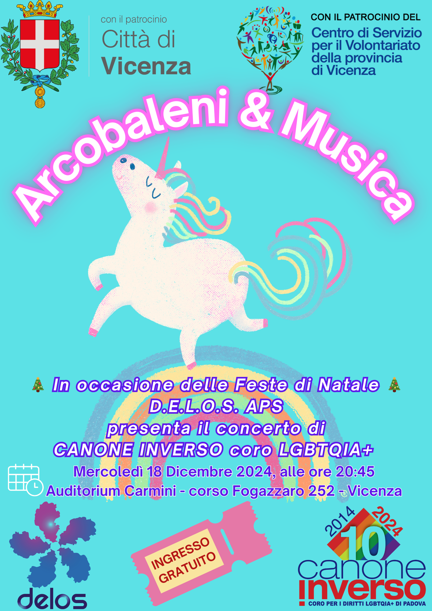 Serata organizzata da D.E.L.O.S. APS, associazione che promuove inclusione, parità di generi e cultura LGBTQI+, con l'esibizione di CANONE INVERSO, coro di persone LGBTQI+ di Padova che festeggia quest'anno i 10 anni dalla loro formazione. Lo spettacolo è un modo per donare alla cittadinanza un momento leggero in occasione delle prossime festività di Natale e far conoscere le attività associative.
