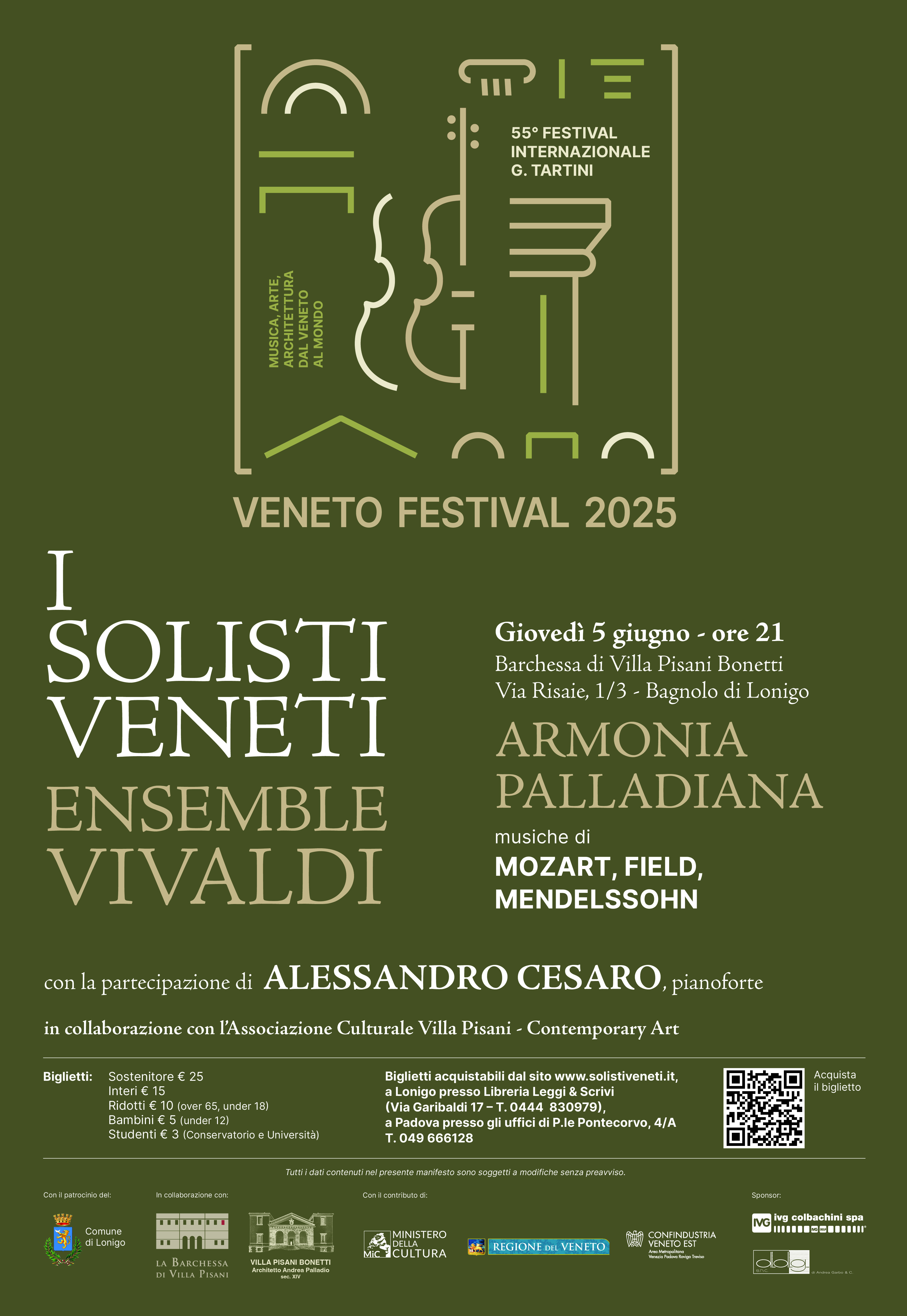 Tre concerti per pianoforte e archi di Mozart, Field e Mendelssohn. Protagonista, nel primo dei tre eventi ospitati dalle architetture del Palladio, il pianista Alessandro Cesaro, accompagnato dall’Ensemble Vivaldi de I Solisti Veneti in un’atmosfera da salotto classico immersa nella bellezza architettonica palladiana. Un raffinato incontro tra architettura e musica da camera. Tre concerti per pianoforte e archi di Mozart, Field e Mendelssohn. Protagonista, nel primo dei tre eventi ospitati dalle architetture del Palladio, il pianista Alessandro Cesaro, accompagnato dall’Ensemble Vivaldi de I Solisti Veneti in un’atmosfera da salotto classico immersa nella bellezza architettonica palladiana. Un raffinato incontro tra architettura e musica da camera.