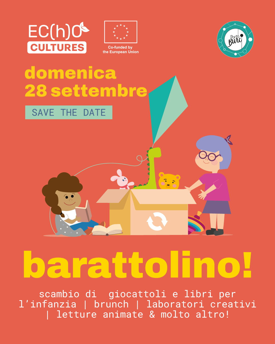 Domenica 28 settembre torna finalmente barattolino! a Porto Burci: l’evento di FACT! dedicato a bambini e bambine: baratto, giochi, laboratori e letture per imparare fin da piccoli a pensare... circolare! E per tutto il giorno ti aspettiamo al bancone di Circolo Cosmos con colazione, brunch, aperitivi e gelati!