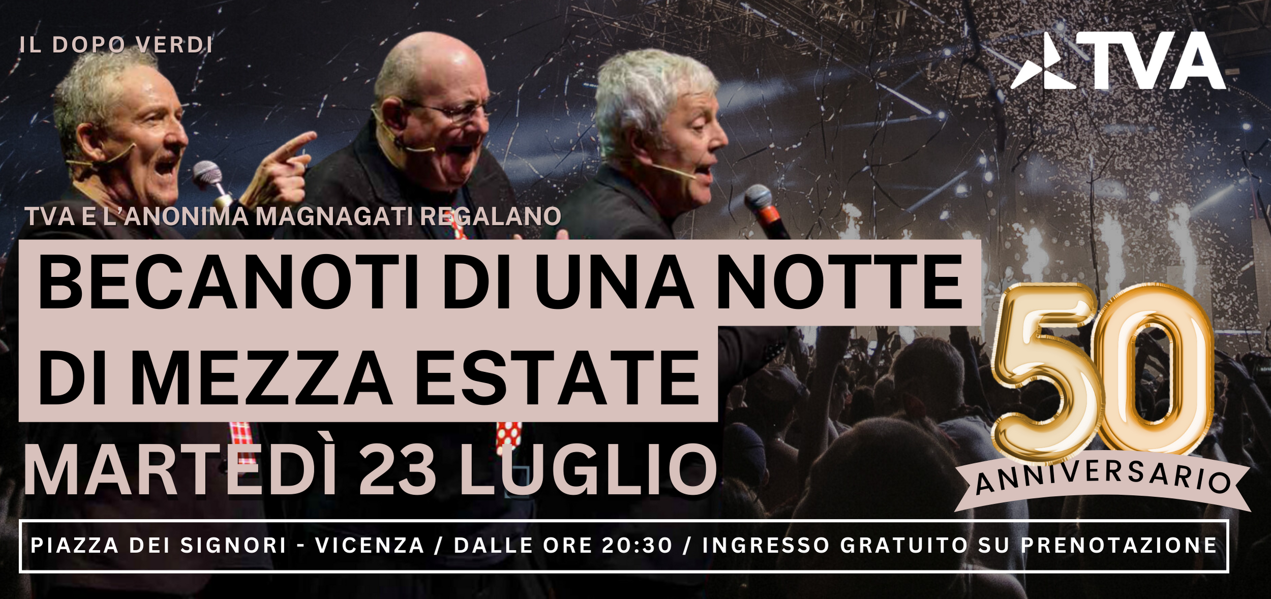 L’ironia graffiante, della musica originale, delle parodie, della comicità e della riflessione sociale che da sempre caratterizza il teatro moderno del gruppo dell’Anonima Magnagati. Composta da Pierandrea “Barbu” Barbujani, Ferruccio “Uccio” Cavallin e Roberto “Batu” Meneguzzo, la formazione porterà nel centro storico di Vicenza il suo teatro moderno, che si fonda sulla tradizione dialettale veneta, la commedia dell'arte e la grande musicalità. I tre comici saranno accompagnati dall’intramontabile band composta da Silvia Carta, Giuliano Pastore, Alcide Ronzani e Nicola Maranzan e dalle voci del Coro di Vicenza diretti dal Maestro Giuliano Fracasso.
