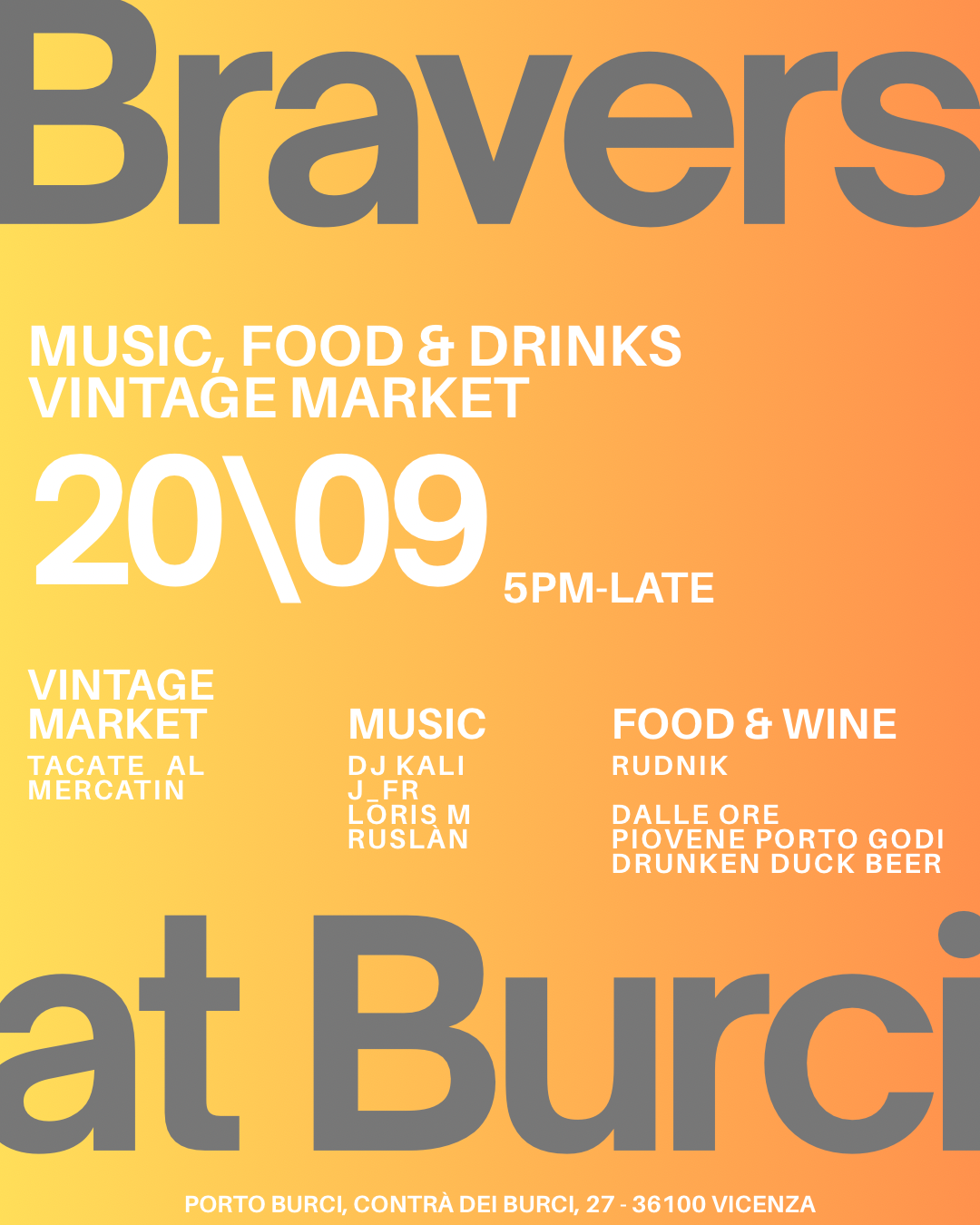 Bravers, in collaborazione con Porto Burci, torna con un nuovo appuntamento fatto di vintage market, dischi, buon cibo e vino, il tutto accompagnato da una selezione musicale di dj locali e internazionali.Vintage market by: Tacate al mercatinMusic by: Dj Kali / J_fr / Loris M / RuslànFood by: Rudnik
