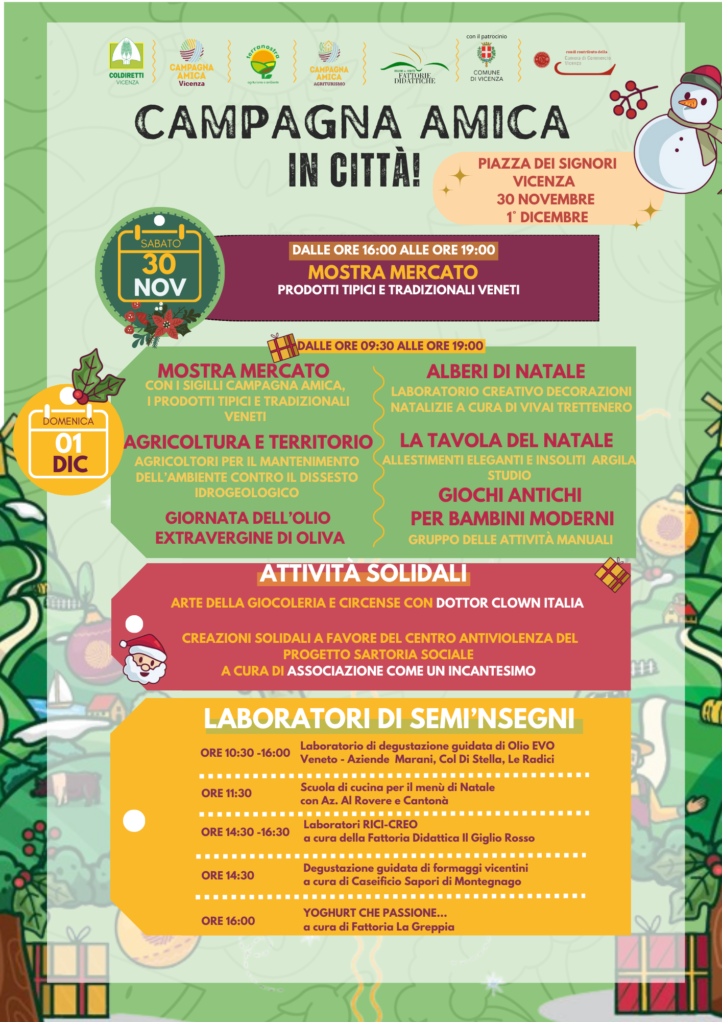 Domenica 1° dicembre continua la mostra mercato delle eccellenze agroalimentari vicentine e venete; durante la giornata si susseguiranno laboratori didattici, show- cooking, momenti di scuola di cucina. Vi sarà animazione a cura Dottor Clown Italia e giochi manuali; Vi sarà- uno spazio dedicato all'approfondimento sui temi della gestione e manutenzione dell'ambiente contro il dissesto idrogeologico e uno spazio dedicato al progetto di Sartoria solidale a favore del centro antiviolenza.