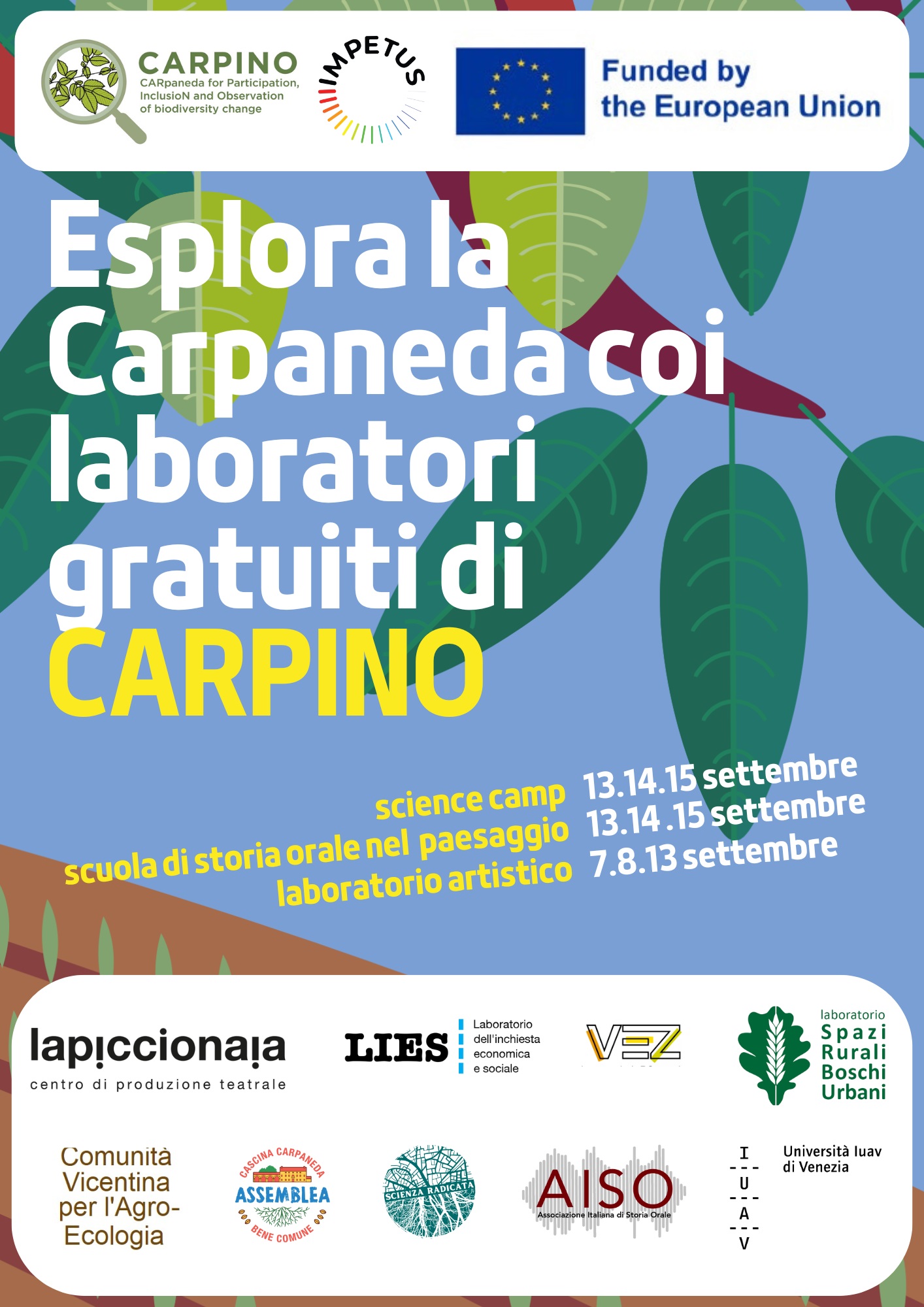 CARPINO CARpaneda for Participation, InclusioN and Observation of biodiversity change è realizzato da La Piccionaia in collaborazione con LIES Laboratorio dell’Inchiesta Economica e Sociale, VeZ Veneto Ecologia Z Generation, Scienza Radicata, Laboratorio Spazi Rurali e Boschi Urbani, Comunità Vicentina per l’Agroecologia, Assemblea Cascina Carpaneda Bene Comune, AISO Associazione Italiana di Storia Orale, Università IUAV di Venezia.