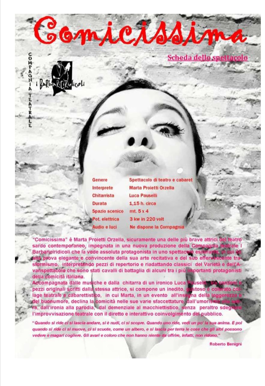 “Comicissima” è Marta Proietti Orzella, di Ghilarza, tra le più brave attrici del teatro sardo contemporaneo, assoluta protagonista in uno spettacolo esilarante, in cui dà prova elegante e convincente della sua arte recitativa e del suo effervescente trasformismo, interpretando pezzi di repertorio e riadattando classici del Varietà e dell'Avanspettacolo che sono stati cavalli di battaglia di alcuni tra i più importanti protagonisti della comicità italiana.