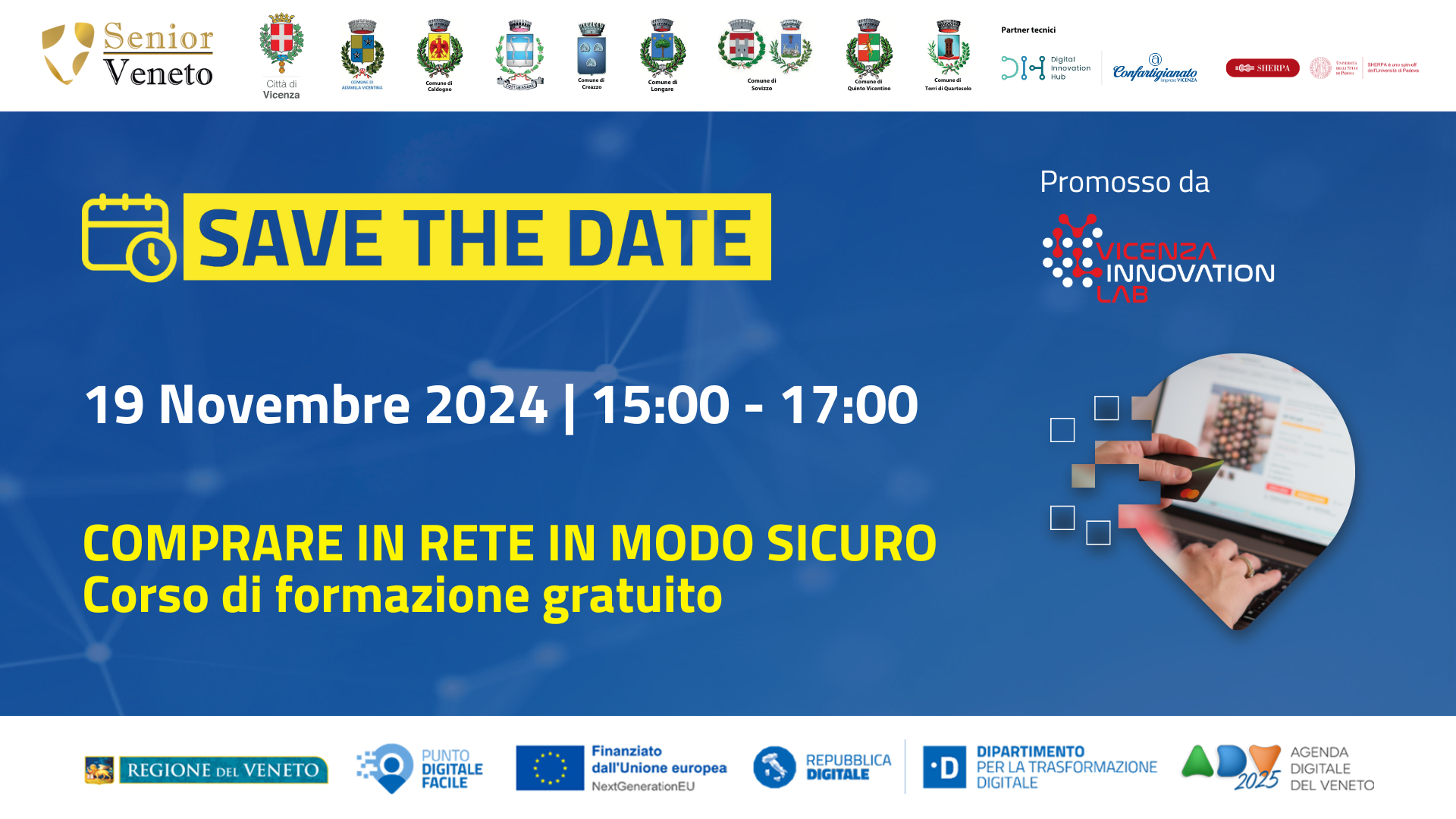 Il Comune di Vicenza, in collaborazione con il Digital Innovation Hub Vicenza e Sherpa, è lieto di annunciare l’evento “Acquisti online”, un corso di formazione gratuito che si terrà il 19 novembre 2024 dalle 15.00 alle 17.00.