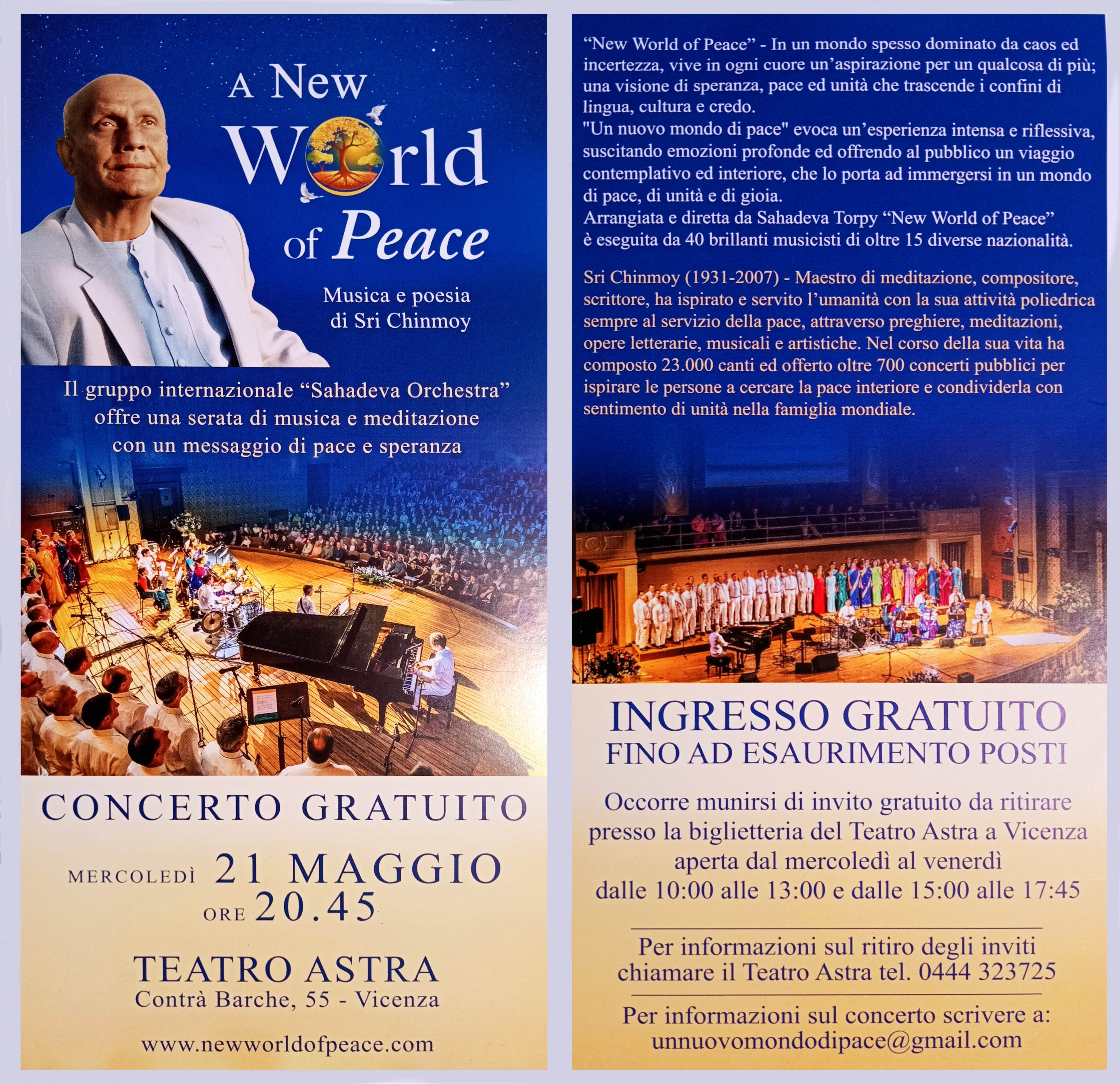 In un mondo spesso dominato da caos ed incertezza, vive in ognuno di noi un’aspirazione per qualcosa di più: una visione di speranza, un luogo in cui trascendere i confini di lingua, cultura e religione. “New World of Peace” evoca un’esperienza intensa e riflessiva, suscitando emozioni profonde ed offrendo al pubblico un viaggio contemplativo ed interiore, che lo porta ad immergersi in un mondo di pace, di unità e di gioia. Arrangiata sulla base delle musiche di Sri Chinmoy e diretta da Sahadeva Torpy, “New World of Peace” è eseguita da 40 talentuosi musicisti di oltre 15 diverse nazionalità.