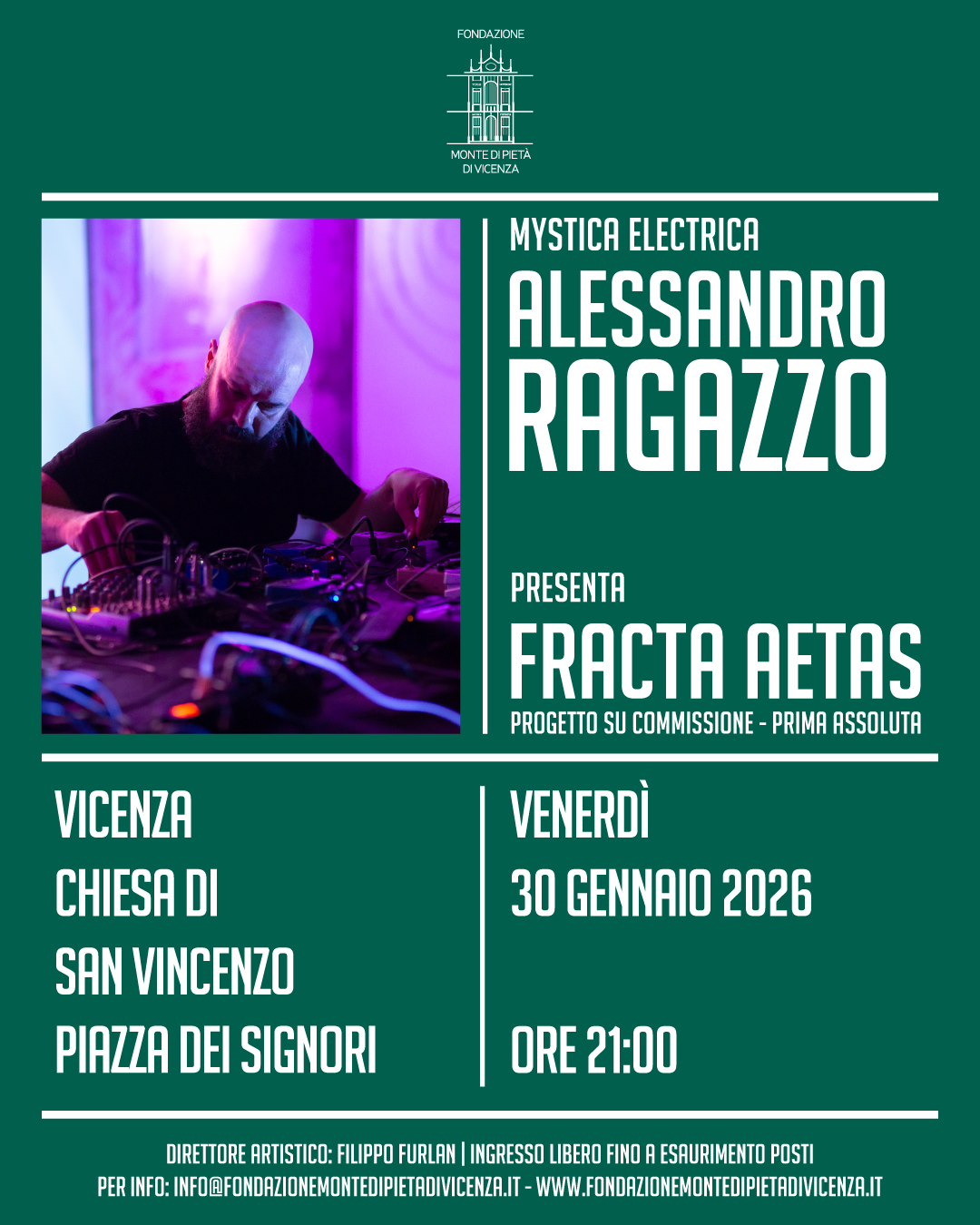 Protagonista della serata sarà Alessandro Ragazzo, che per l’edizione 2026 di Mystica Electrica presenterà in prima assoluta Fracta Aetas, il progetto sonoro realizzato in esclusiva per la stagione della Fondazione. Fracta Aetas è un lavoro che pone al centro il paesaggio sonoro, inteso come spazio di attraversamento tra ambienti concreti e dimensioni interiori. Il titolo richiama il pensiero di Lucrezio, che nel De Rerum Natura descrive un mondo consumato dal tempo, prossimo alla dissoluzione. A partire da questa visione, Alessandro Ragazzo costruisce un’esperienza d’ascolto che sovverte la narrazione delle registrazioni ambientali, aderendo all’idea della caducità del tempo e della materia.