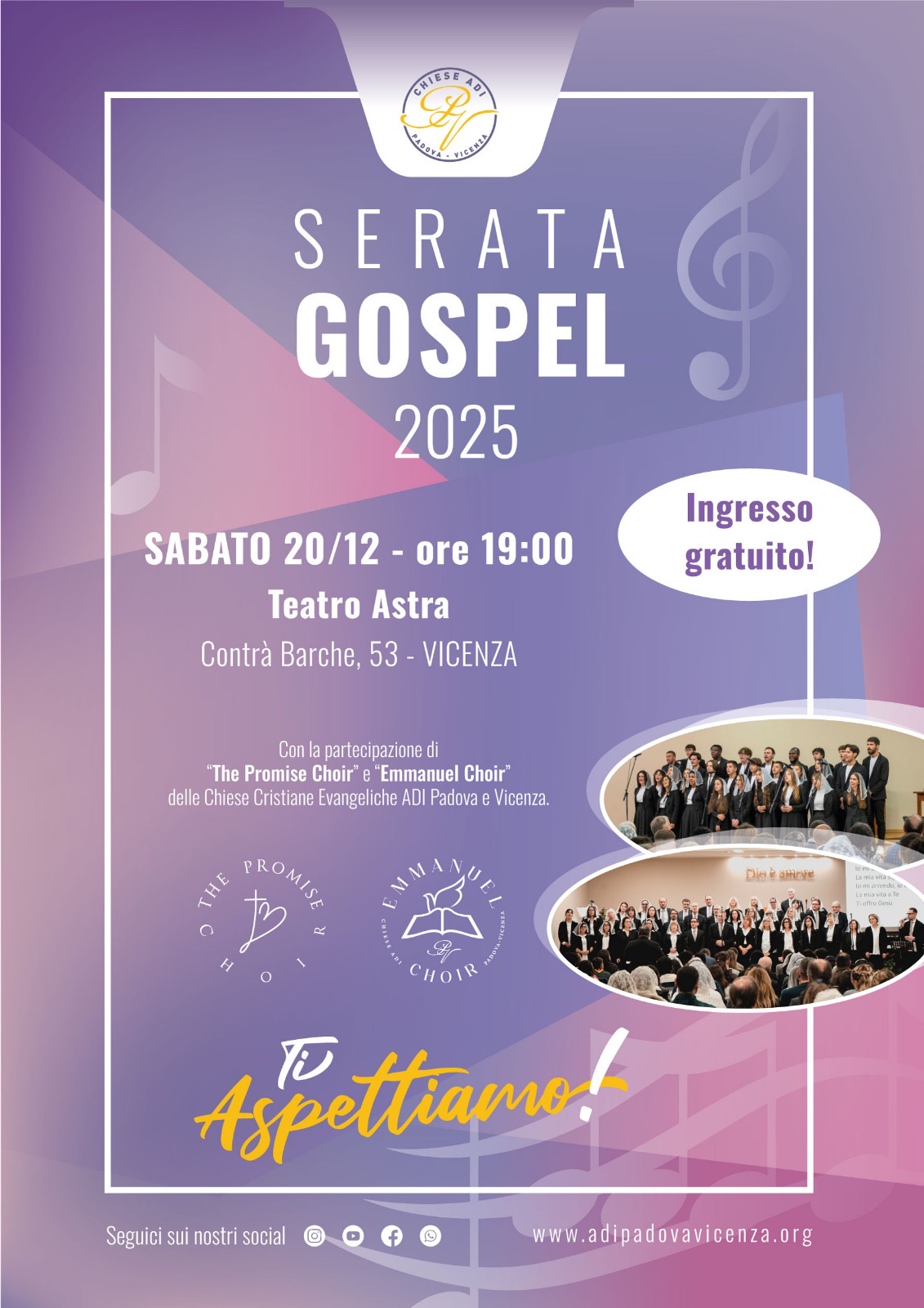 Vi aspettiamo per condividere un'occasione unica di ascolto e riflessione sulle note della musica Gospel, con la partecipazione dei cori "The Promise" ed "Emmanuel".