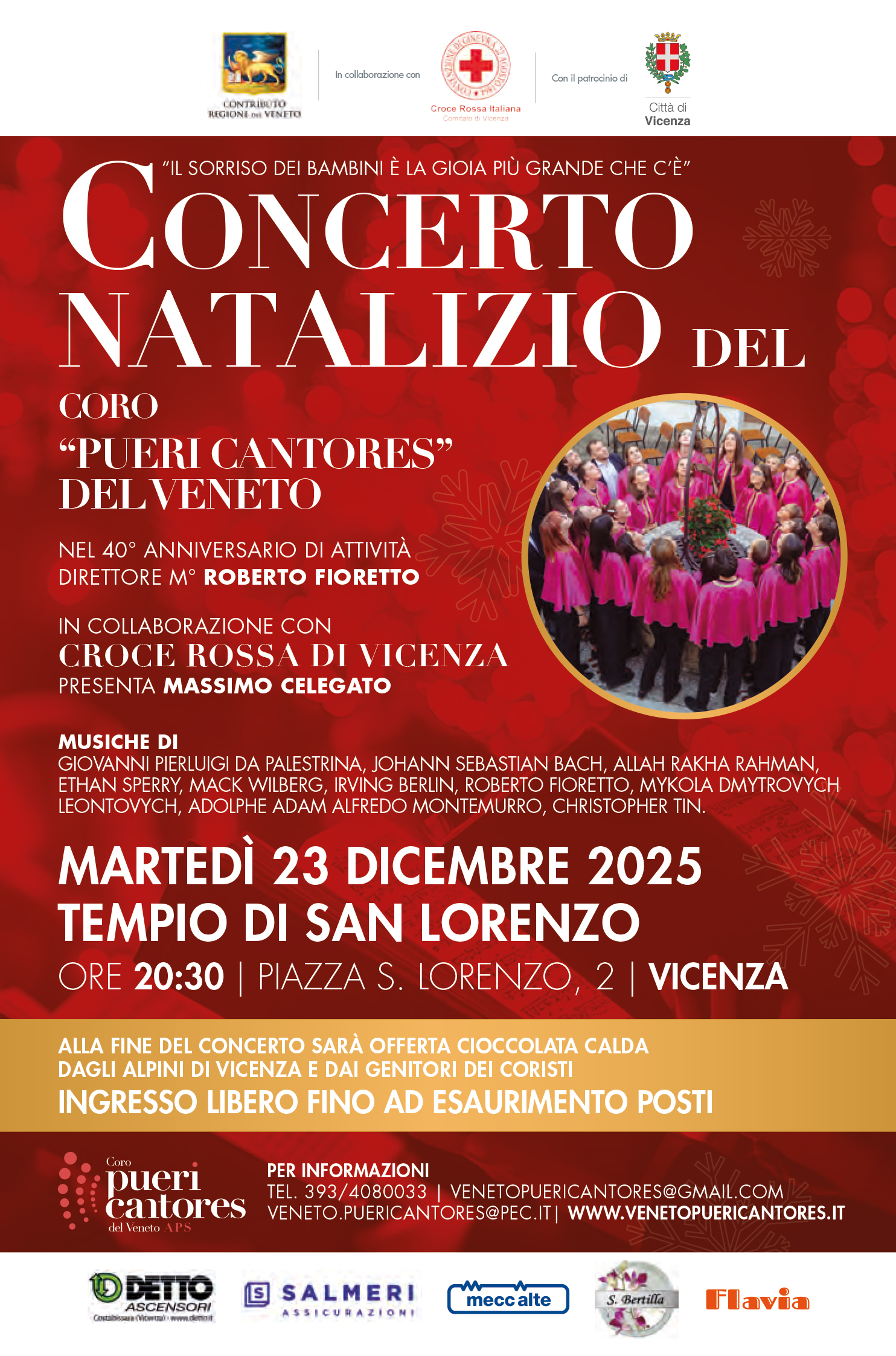Quest'anno il coro "Pueri Cantores" del Veneto realizzerà il suo tradizionale concerto di Natale martedì 23 dicembre alle ore 20:30 presso il Tempio di San Lorenzo a Vicenza. L’evento offrirà al pubblico un’interpretazione di raffinati brani della tradizione natalizia con nuove e accattivanti elaborazioni. Sarà altresì proposta una dedica speciale a tre figure centrali della storia musicale che celebra il cinquecentenario della nascita di Giovanni Pierluigi da Palestrina, il centenario della morte di Erik Satie e il centenario della nascita di Luciano Berio quale occasione per far rivivere i loro capolavori estetici che hanno contribuito ad abbellire e migliorare il mondo e la società che siamo tutti noi. Le loro incredibili opere e il loro lascito ci responsabilizzano a dare continuità a quei valori e principi che hanno guidato la loro e la nostra formazione di vita. Attraverso un momento di riflessione, le voci delle giovani generazioni acquistano così un valore simbolico ancora più forte contribuendo a costruire una società fondata sull'accoglienza, sull'empatia e sul rispetto reciproco capace di veicolare un messaggio di pace e fratellanza attraverso il linguaggio universale della musica in un periodo segnato da forti tensioni globali.