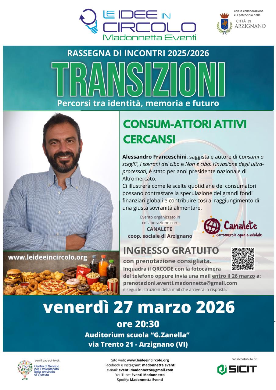 ARZIGNANO (VI) – All’interno della rassegna culturale 2025/2026 “TRANSIZIONI”, organizzata dall’associazione Le idee in Circolo APS, si terrà l’incontro dal titolo “Consum-attori attivi cercansi”. L’appuntamento è fissato per venerdì 27 marzo 2026, alle ore 20.30, presso l’Auditorium Zanella di Arzignano.