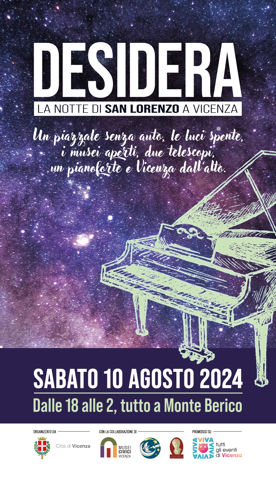 Per un’osservazione scientifica, il Gruppo Astrofili Vicentini “G. Abetti” proporrà un viaggio tra le stelle e la luna. Sarà infatti possibile osservare il cielo alla ricerca delle Perseidi, con l’aiuto di laser che raggiungono il cielo con i quali gli esperti mostreranno le costellazioni, fino a far "atterrare" i presenti sulla Luna, della quale si vedranno i dettagli e i crateri grazie all’allestimento di due telescopi.