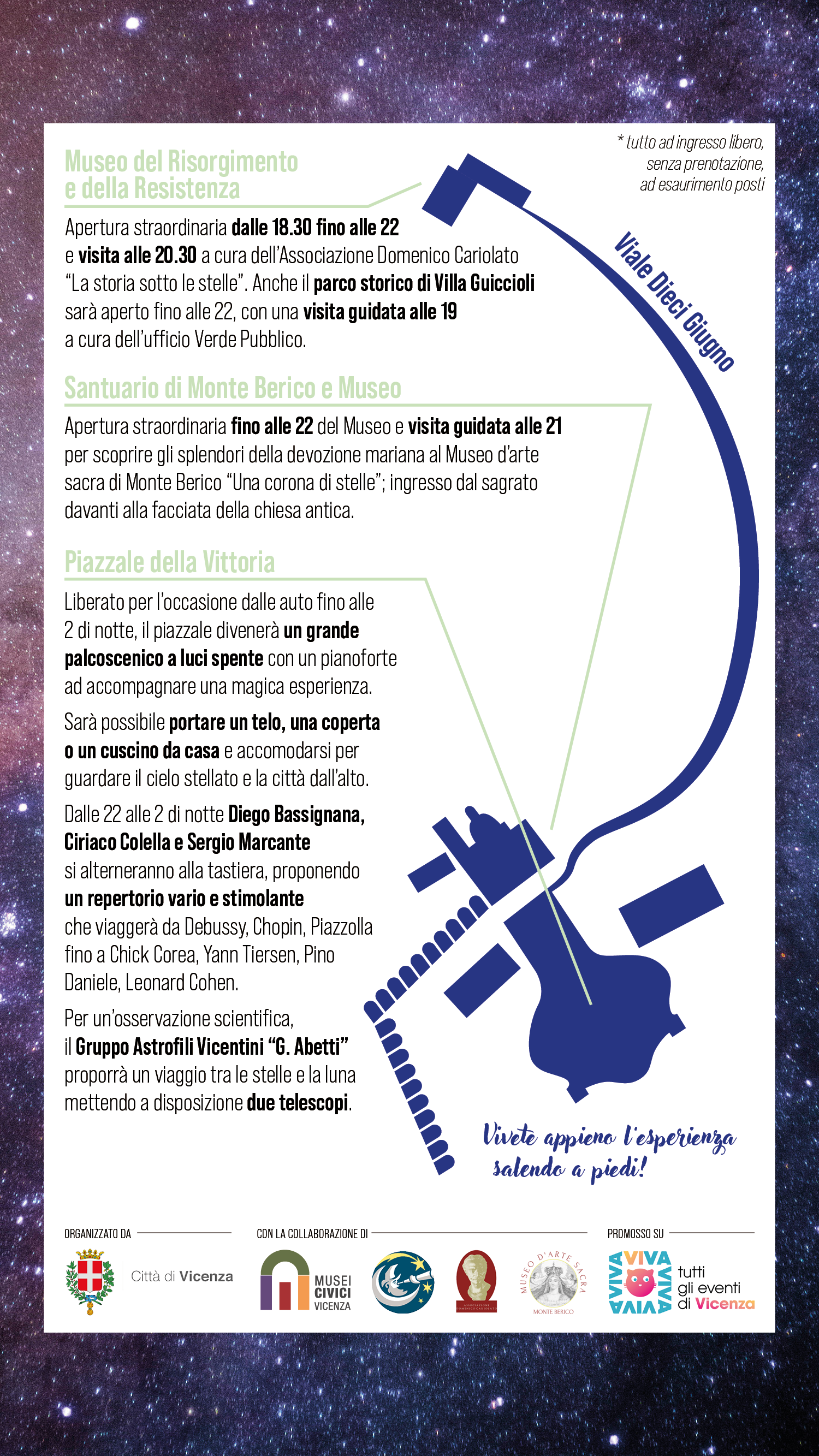 Piazzale della Vittoria sarà libero dalle auto sabato 10 agosto dalle 16 alle 2 di notte e le luci rimarranno spente per consentire una maggior visuale del cielo stellato. Per tutta la durata dell'iniziativa, dalle 18 alle 2 di notte, sarà possibile accomodarsi sul piazzale con un telo, una coperta o un cuscino portati da casa per guardare le stelle e la città dall’alto.