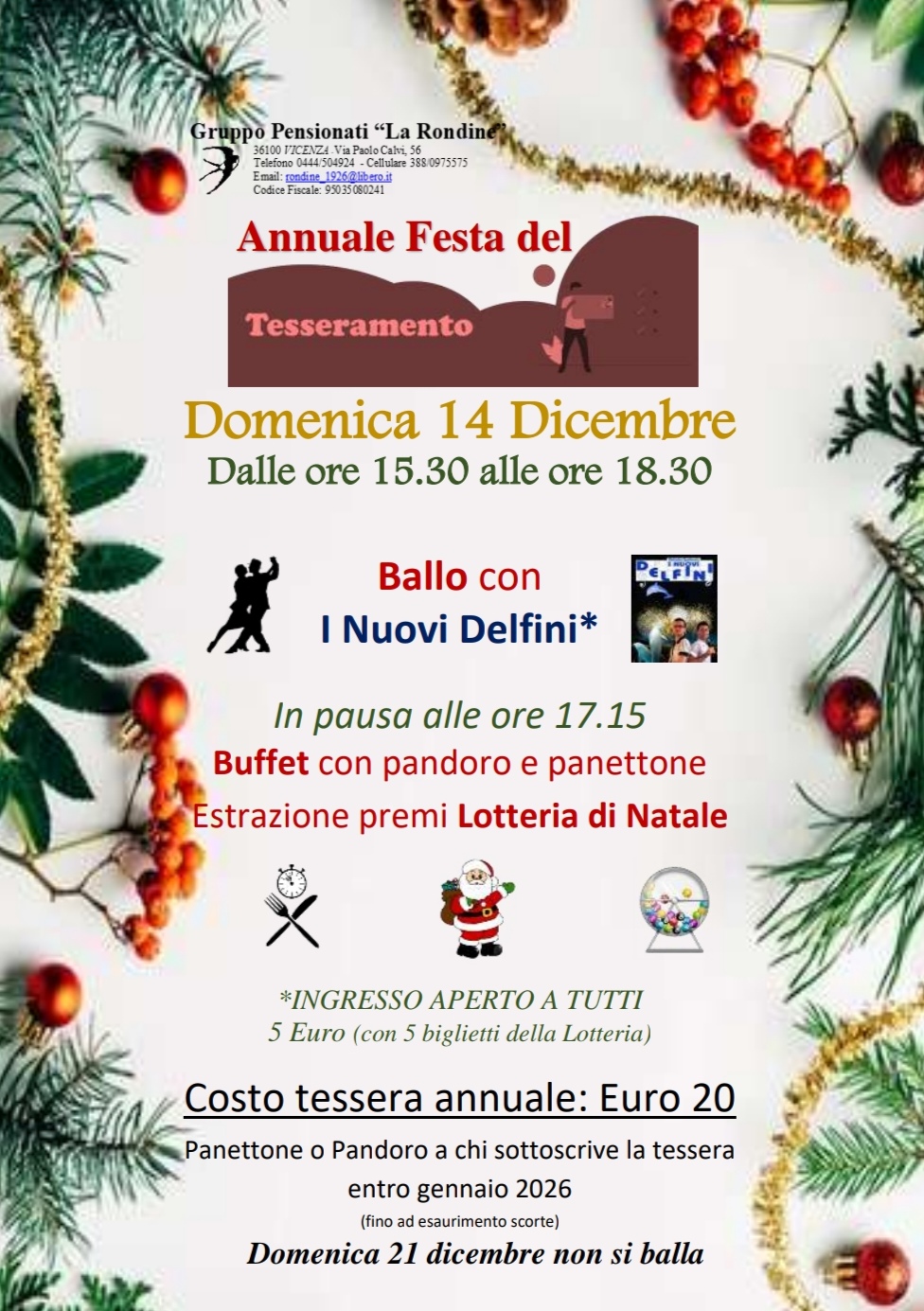 Ore 17:15 Sorteggio premi lotteria di Natale e a seguire Buffet natalizio;