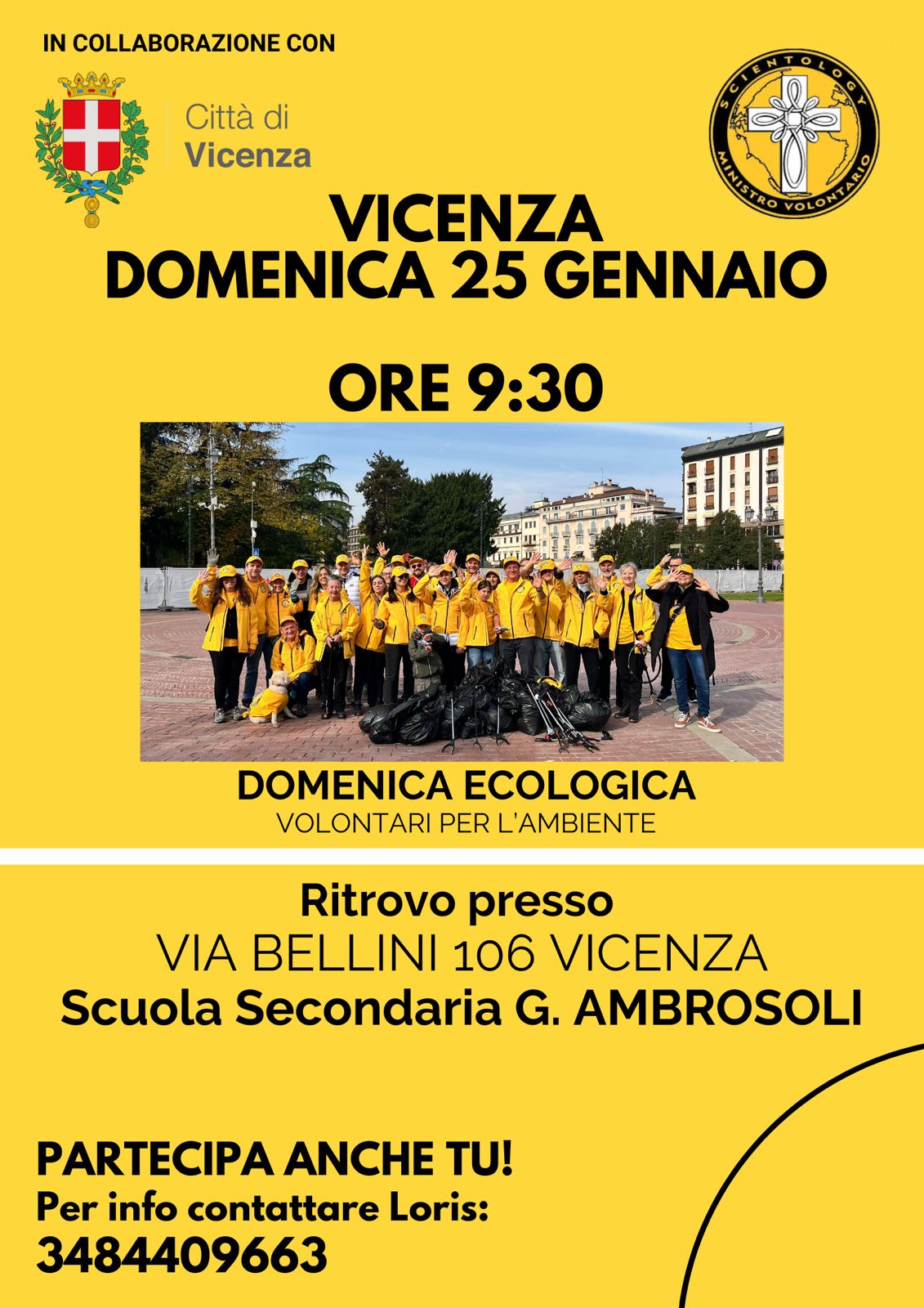 I Ministri Volontari di Scientology di Vicenza hanno deciso di partecipare alla Giornata Ecologica prevista per domenica 25 gennaio 2026. Dalle ore 9:30 si troveranno con chiunque abbia a cuore il verde pubblico, presso la Scuola Secondaria G. Ambrosoli, in via Bellini 106 a Vicenza per un'iniziativa di clean-up (raccolta rifiuti).