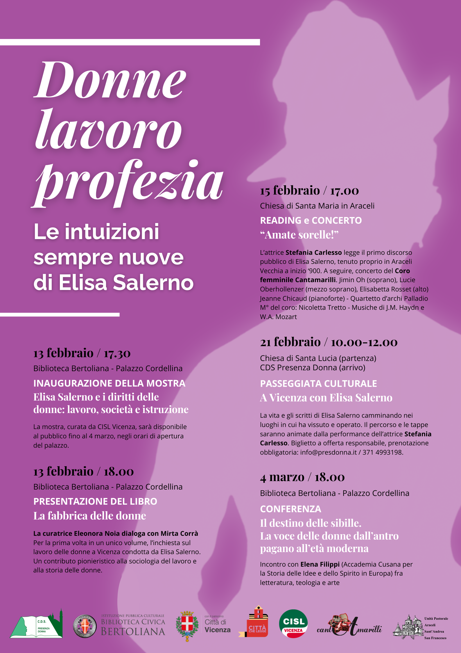 Tra febbraio e marzo 2026 Vicenza ospita una serie di appuntamenti dedicati a Elisa Salerno, femminista cattolica vicentina e figura pionieristica dell’impegno femminile nel Novecento. Salerno avviò la sua attività pubblica con una conferenza nella chiesa di Santa Maria in Araceli, invitando le donne a formarsi culturalmente e ad associarsi per migliorare la propria condizione, dando poi vita al giornale La donna e il lavoro.