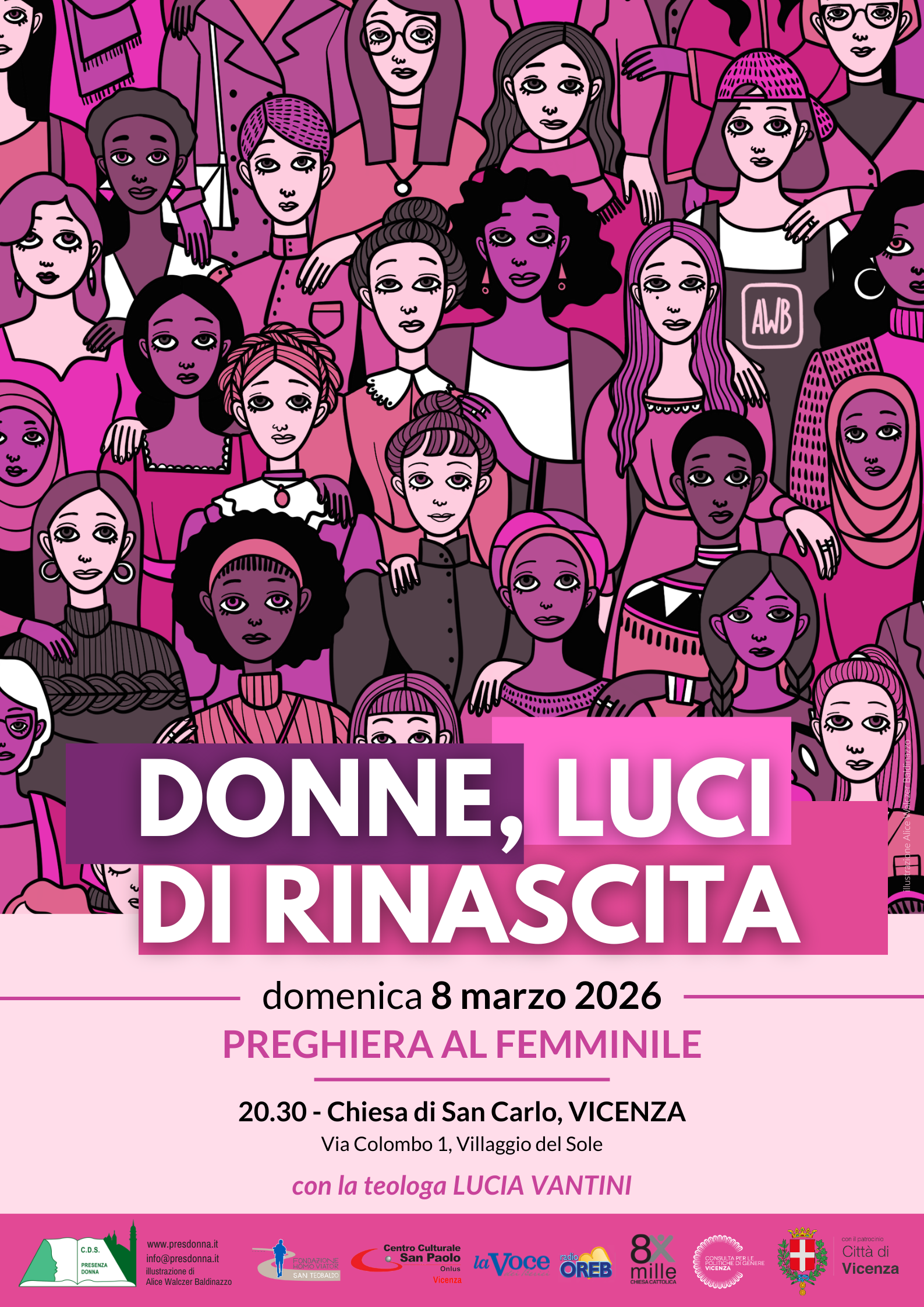 L’iniziativa nasce dalla collaborazione fra Presenza Donna, Fondazione Homo Viator San Teobaldo, La Voce dei Berici, Radio Oreb, Centro Culturale San Paolo, Consulta per le politiche di genere Vicenza; è patrocinata dal Comune di Vicenza ed è realizzata anche grazie al contributo del progetto 8xmille della Chiesa cattolica.