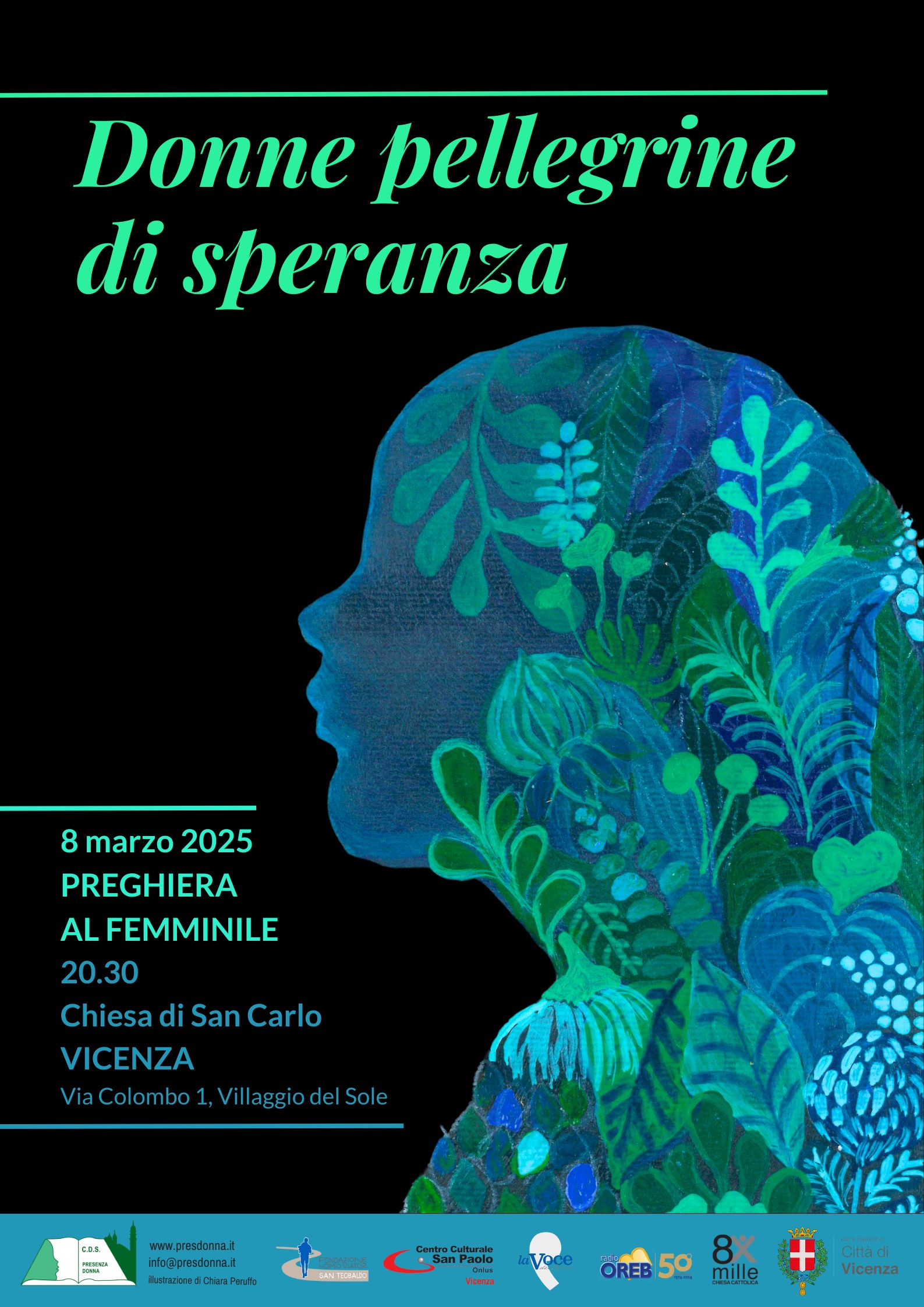Sabato 8 marzo 2025 si rinnova il tradizionale appuntamento con la preghiera al femminile in occasione dell’8 marzo e della Giornata internazionale dei diritti della donna. La preghiera si svolgerà alle 20.30 presso la chiesa di San Carlo al Villaggio del Sole a Vicenza (via Colombo 1).