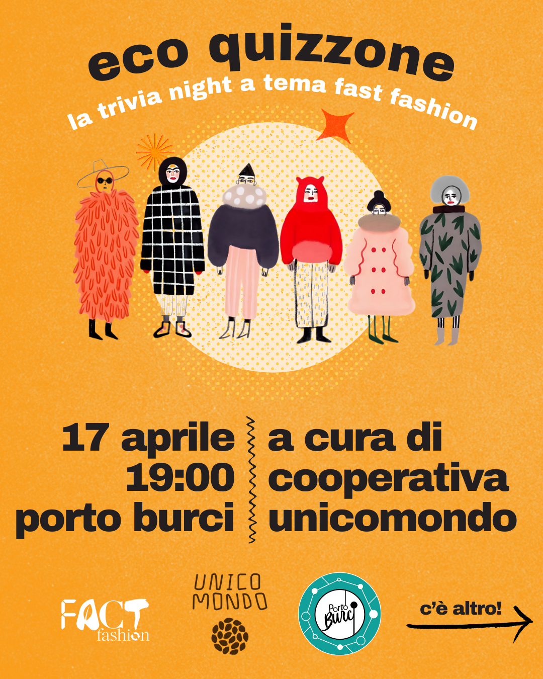 Gareggia in solitaria, o con lɜ tuɜ amicɜ, o contro di loro, o con lɜ amicɜ dellɜ tuɜ amicɜ, porta la famiglia, chi ti pare… Partecipa all’eco-quizzone di Cooperativa Unicomondo per scoprire quanto ne sai sul tema Fast Fashion! Iscriviti subito, da solə o con la tua squadra. Trovi il form di iscrizione QUI (oppure potrai iscriverti la sera stessa).