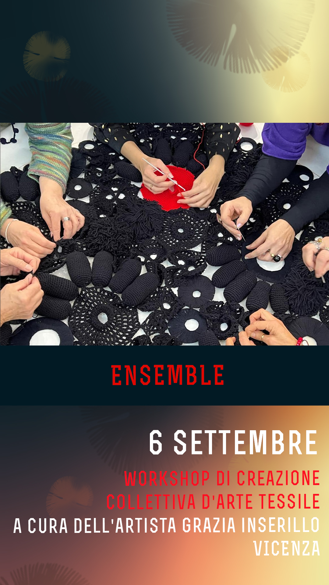 Il workshop è rivolto a chiunque voglia sperimentare il processo creativo dell’artista nel creare i propri arazzi materici, assaporando la fase finale dell’ensemble, ossia dell’assemblaggio, caratterizzato dalla messa in creazione dell’opera attraverso l’uso della lana (messa a disposizione dell’artista) e aghi per lana, ognuno il proprio, in un extempore collettivo.