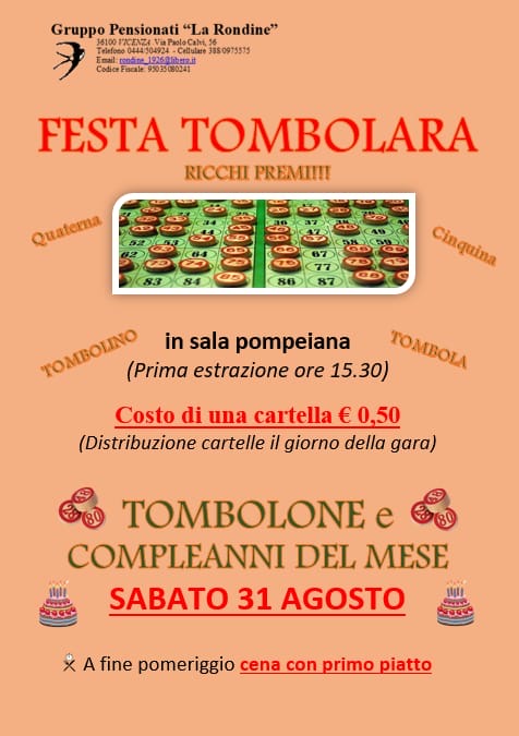 Tombolone con ricchi premi in sala pompeiana. Prima estrazione alle ore 15,30. Distribuzione delle cartelle il giorno della gara.