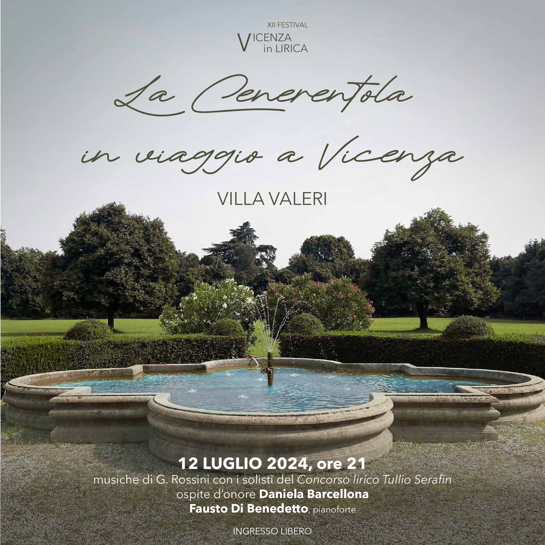 A Villa Valeri, il 12 luglio alle ore 21, La cenerentola in viaggio a Vicenza: anteprima, in forma di concerto, dell'opera La Cenerentola di Rossini che andrà in scena al Teatro Olimpico il 14 e 15 settembre. Il M° Fausto Di Benedetto accompagna al pianoforte. Ospite d’onore della serata il mezzosoprano Daniela Barcellona.