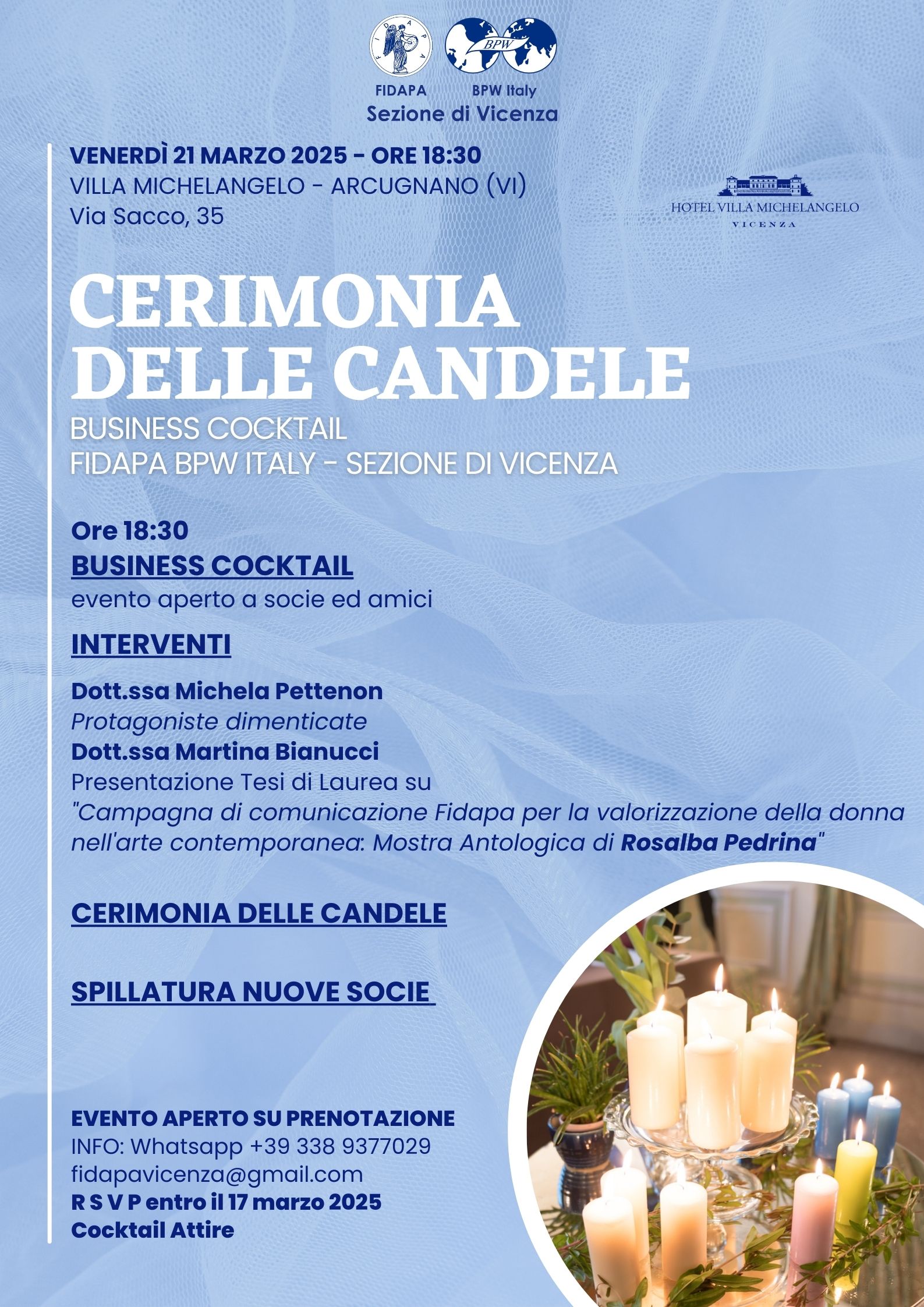 FIDAPA BPW Italy Sezione di Vicenza si riunisce per la tradizionale Cerimonia delle Candele, l’evento annuale che rinnova l’impegno dell’associazione nei confronti delle donne e accoglie le nuove socie. L’appuntamento dedicato a tutte le associate e agli amici si svolgerà venerdì 21 marzo 2025 alle ore 18:30 a Villa Michelangelo ad Arcugnano (via Sacco 35), un’occasione per riconfermare i valori fondanti e per abbracciare simbolicamente tutte le donne del mondo.