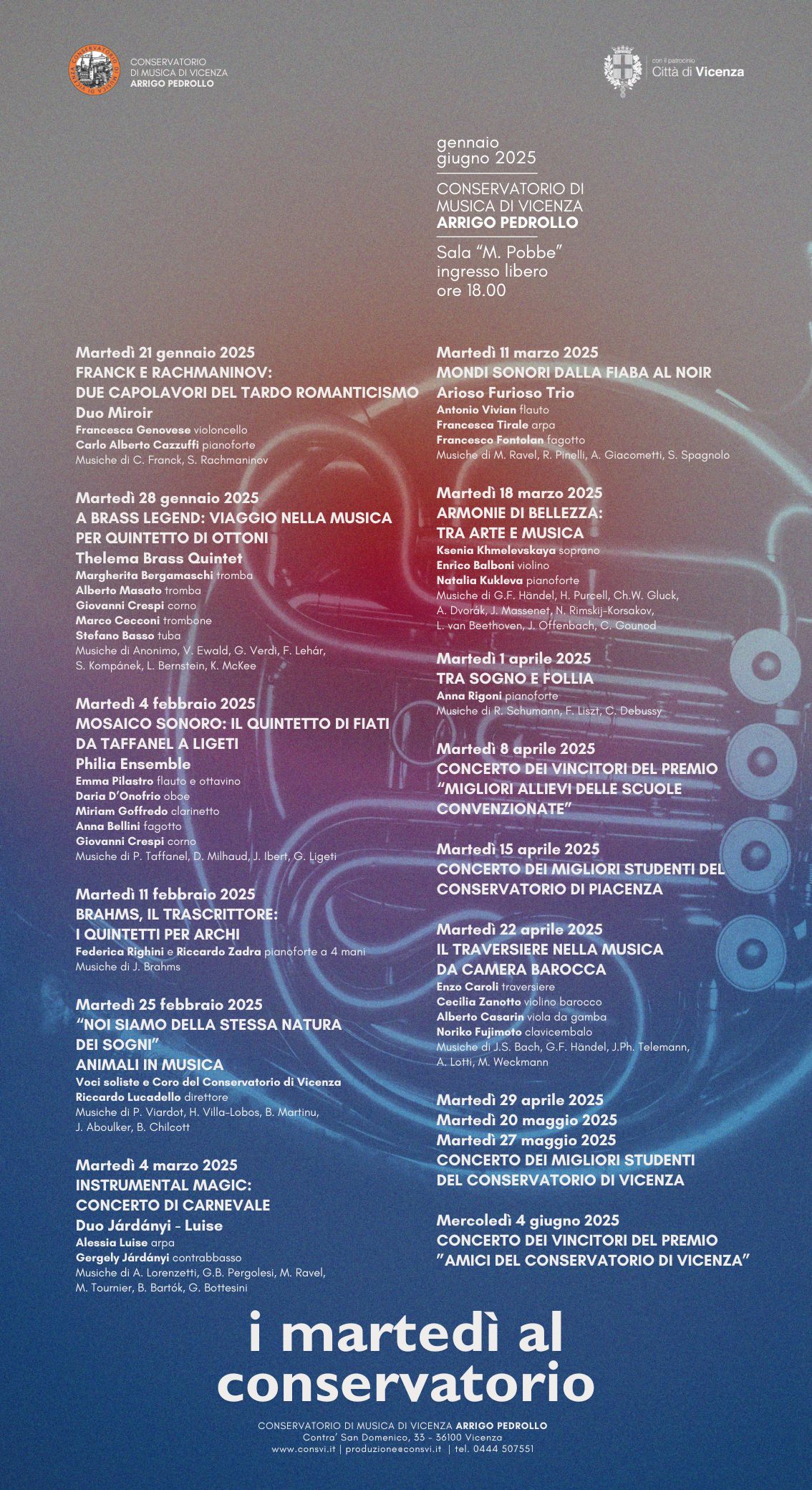 Il concerto dei "Migliori Allievi delle Scuole Convenzionate", che si svolge all'interno della rassegna "I Martedì al Conservatorio", rappresenta il momento culminante della XVII edizione del Premio, un’iniziativa volta a valorizzare il talento degli studenti delle Scuole pubbliche e private convenzionate con il Conservatorio Pedrollo. Dopo un rigoroso processo selettivo, i migliori giovani musicisti delle diverse categorie avranno l'opportunità di esibirsi in un concerto che metterà in luce la loro preparazione e il loro percorso artistico.