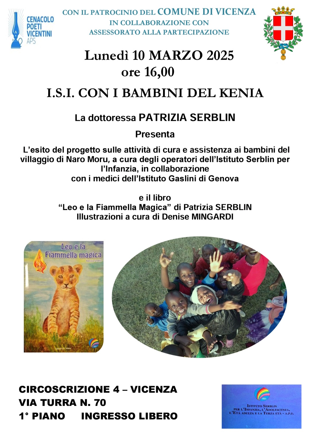 La dott.ssa Patrizia Serblin presenta il progetto sulle attività di cura e assistenza ai bambini del villaggio di Naro Moru, a cura degli operatori dell'Istituto Serblin per l'Infanzia, in collaborazione con i medici dell'Istituto Gaslini di Genova e del libro "Leo e la Fiammella Magica" di Patrizia Serblin, con illustrazioni di Denise Mingardi