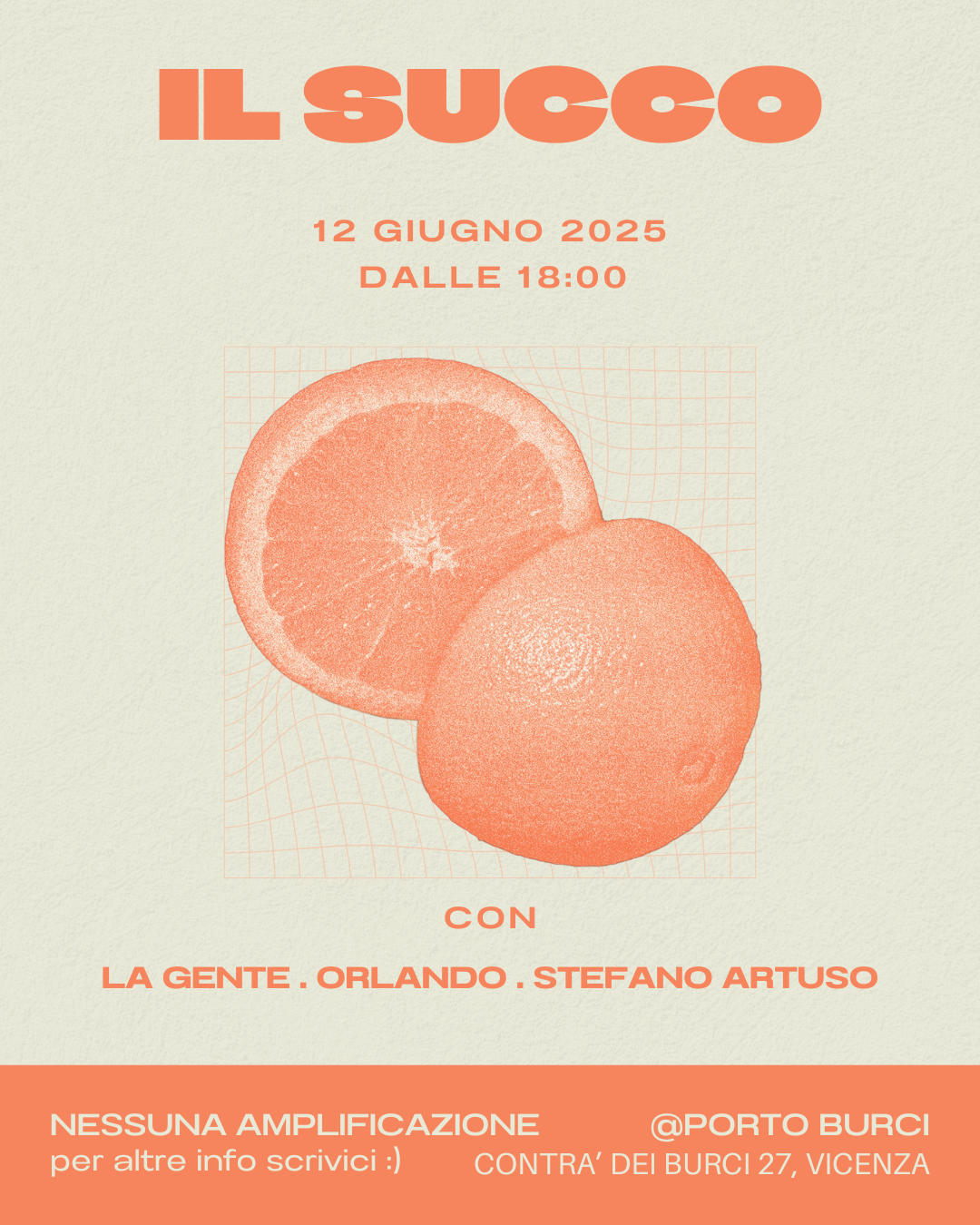 Il succo è stato un cantiere di musica, uno spupazzamento di note e una centrifuga di voci senza filtri. Ora riprende forma, con nuovi artistɜ, nuovi progetti, nuovi nomi, un nuovo posto e nuovi succhetti. Il primo incontro sarà con le voci di Stefano Artuso, Orlando e La Gente che si esibiranno senza amplificazione: un succhetto come al solito te lo diamo noi!