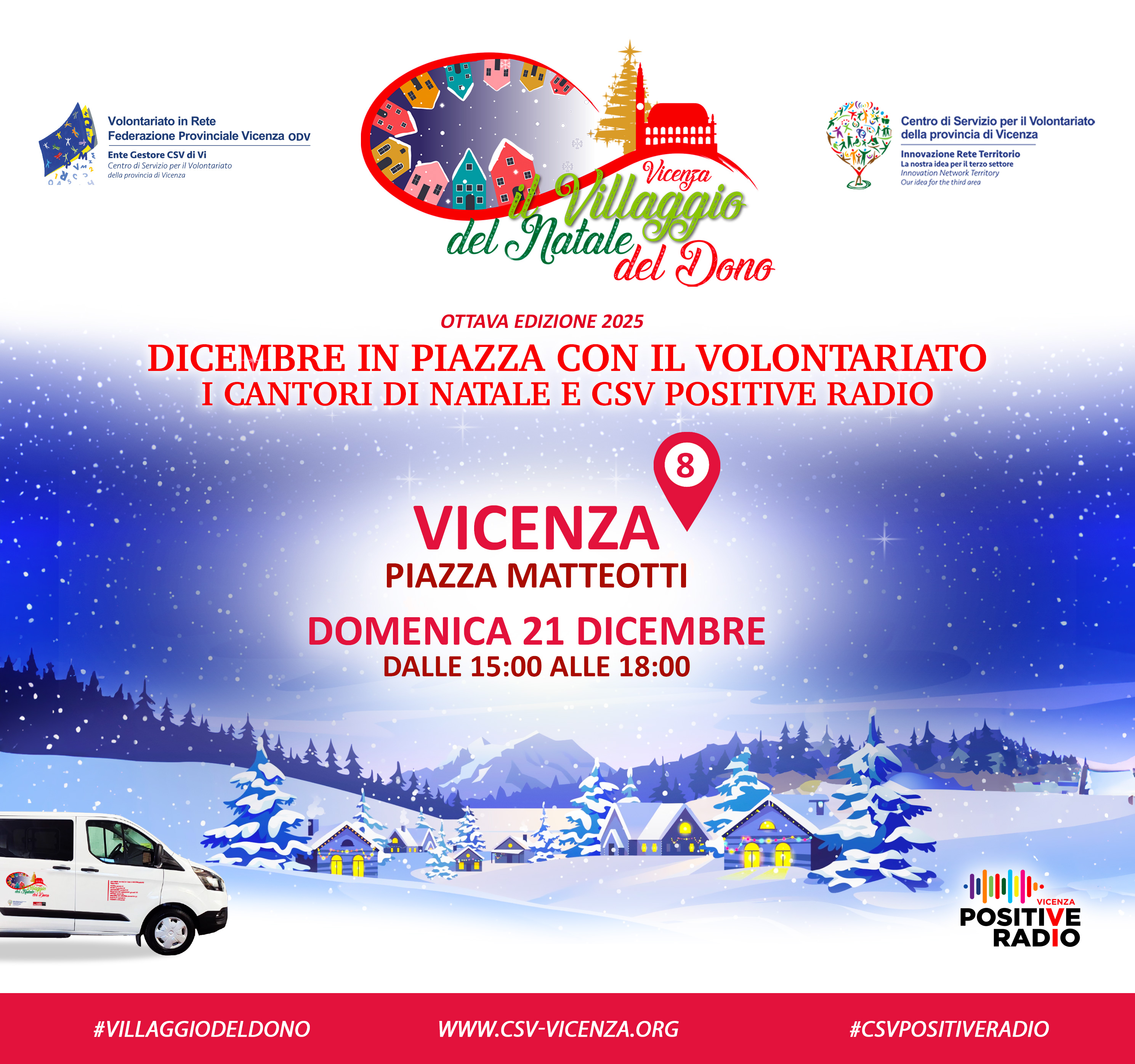 Il CSV di Vicenza ogni anno organizza il “Villaggio del Natale del Dono” per il Volontariato Vicentino e la Cittadinanza. Quest’anno siamo giunti all’Ottava Edizione. Si tratta di sensibilizzare il territorio di Vicenza sul ruolo del Volontariato, cercando di promuovere e diffondere al tempo stesso la cultura del dono al di fuori delle logiche commerciali che caratterizzano questo periodo dell’anno.