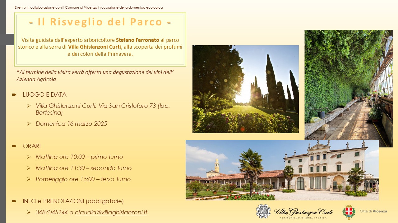 Domenica 16 marzo 2025, in collaborazione con il Comune di Vicenza ed in occasione della domenica ecologica, Villa Ghislanzoni Curti aprirà per la visita guidata al parco storico e alla serra della villa, alla scoperta dei profumi e dei colori della Primavera. Al termine della visita sarà offerta una degustazione dei vini dell'azienda agricola.