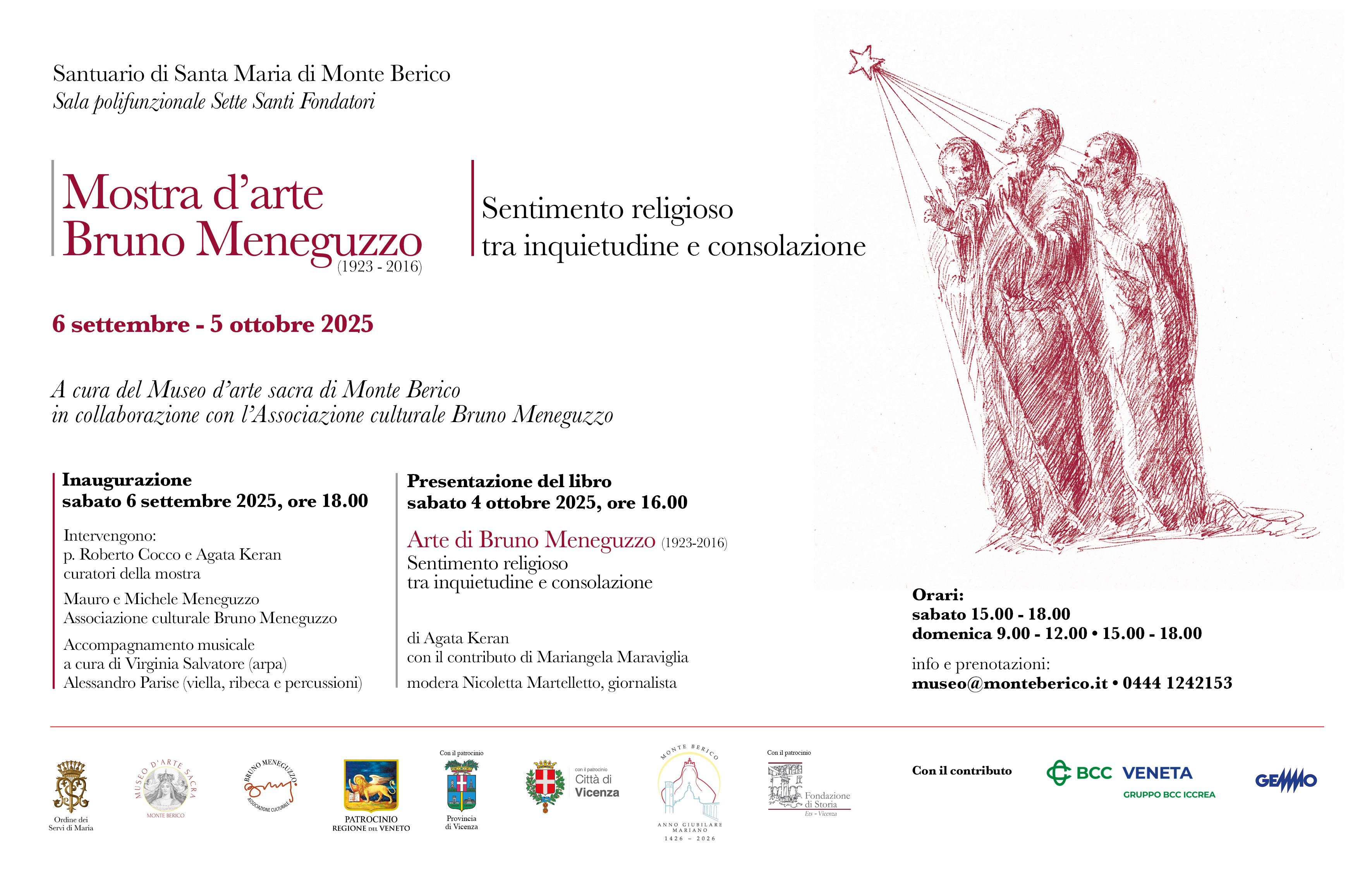 Al Santuario di Santa Maria di Monte Berico, nella sala polifunzionale Sette Santi Fondatori, sabato 6 settembre 2025 alle ore 18.00, verrà inaugurata la mostra dedicata alla produzione grafica e pittorica di Bruno Meneguzzo (1923-2016), a cura del Museo d’arte sacra di Monte Berico, in collaborazione con l’Associazione culturale Bruno Meneguzzo.