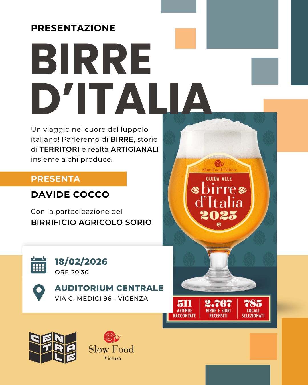 Il primo incontro del progetto si terrà mercoledì 18 febbraio 2026 alle ore 20.30 presso l’Auditorium della Centrale. Protagonista della serata sarà il luppolo, raccontato attraverso le pagine della Guida alle Birre d’Italia di Slow Food.