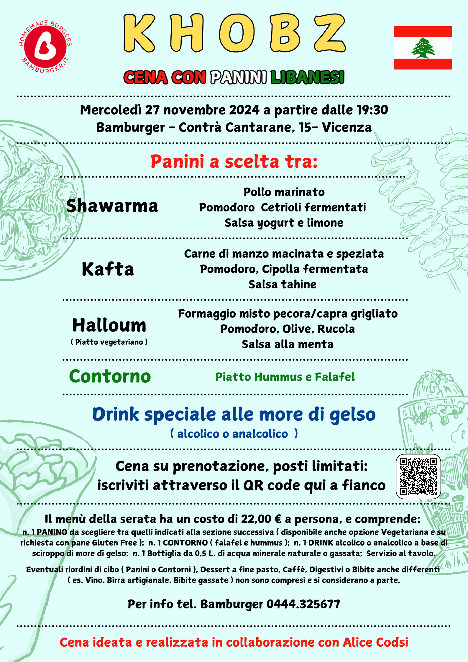 L'evento è organizzato da Alice Codsi in collaborazione con Bamburger. Il menù della serata ha un costo di 22,00 € a persona, e comprende: - n. 1 PANINO da scegliere tra quelli indicati alla sezione successiva ( disponibile anche opzione Vegetariana e su richiesta con pane Gluten Free ** ); - n. 1 CONTORNO ( falafel e hummus );- n. 1 DRINK alcolico o analcolico a base di sciroppo di more di gelso;- n. 1 Bottiglia da 0,5 L. di acqua minerale naturale o gassata;- Servizio al tavolo.Come:Posti limitati, prenotazione obbligatoria esclusivamente attraverso registrazione al link di seguito:Prenotazione cena KHOBS - posti limitati