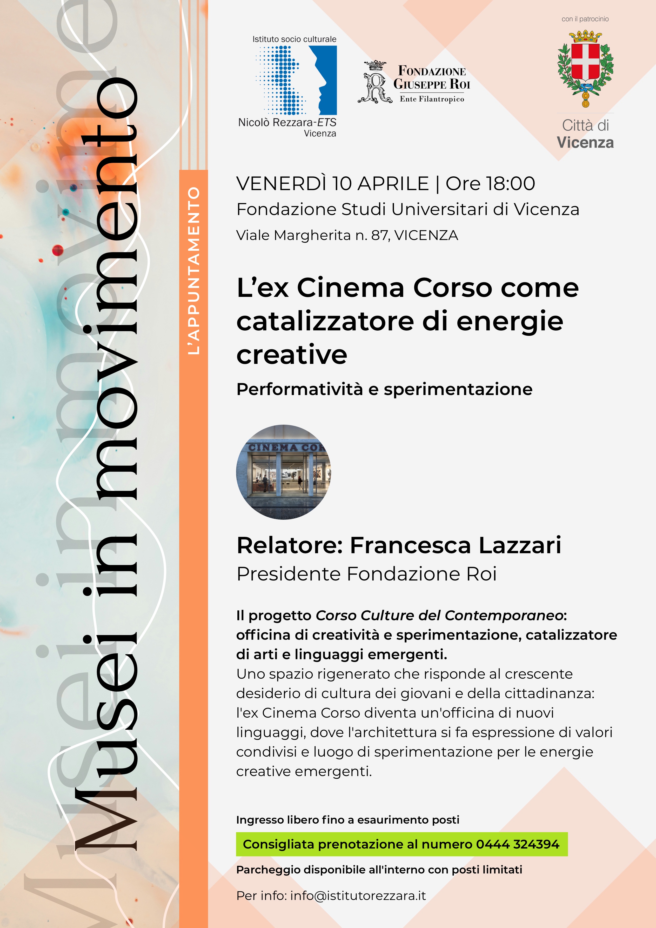 Venerdì 10 aprile Ore 18:00, Francesca Lazzari, Presidente Fondazione Roi, tratta il tema "L’ex Cinema Corso come catalizzatore di energie creative. Performatività e sperimentazione".