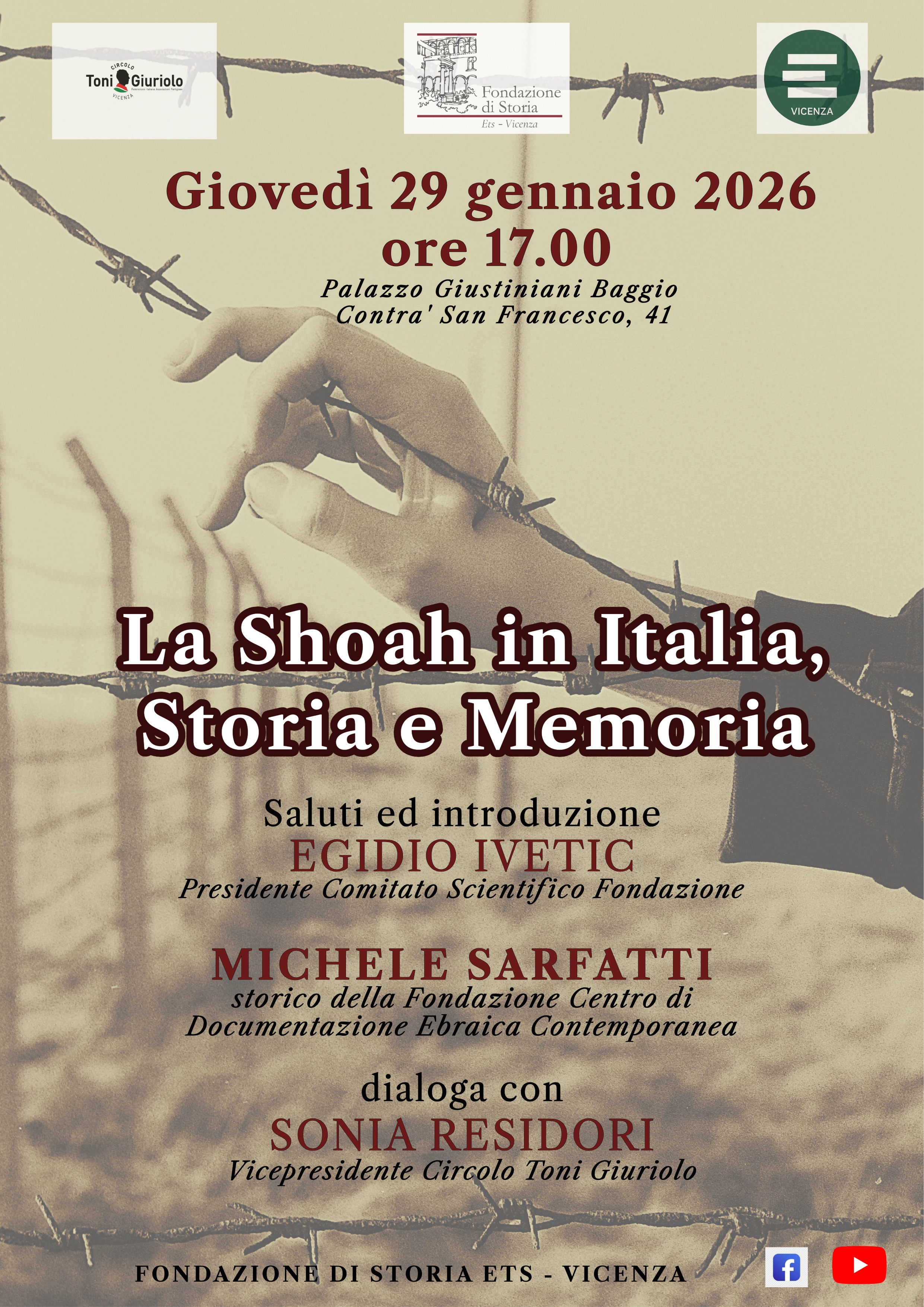 In occasione dell'81° anniversario della Shoah, la Fondazione di Storia, propone al pubblico il 29 gennaio alle ore 17, un incontro con il prof. Michele Sarfatti, storico italiano di storia contemporanea, specializzato nella storia degli ebrei in Italia nel Novecento. La prof.ssa Sonia Residori e il prof. Egidio Ivetic dialogheranno con lo storico su uno dei capitoli più bui della storia umana.