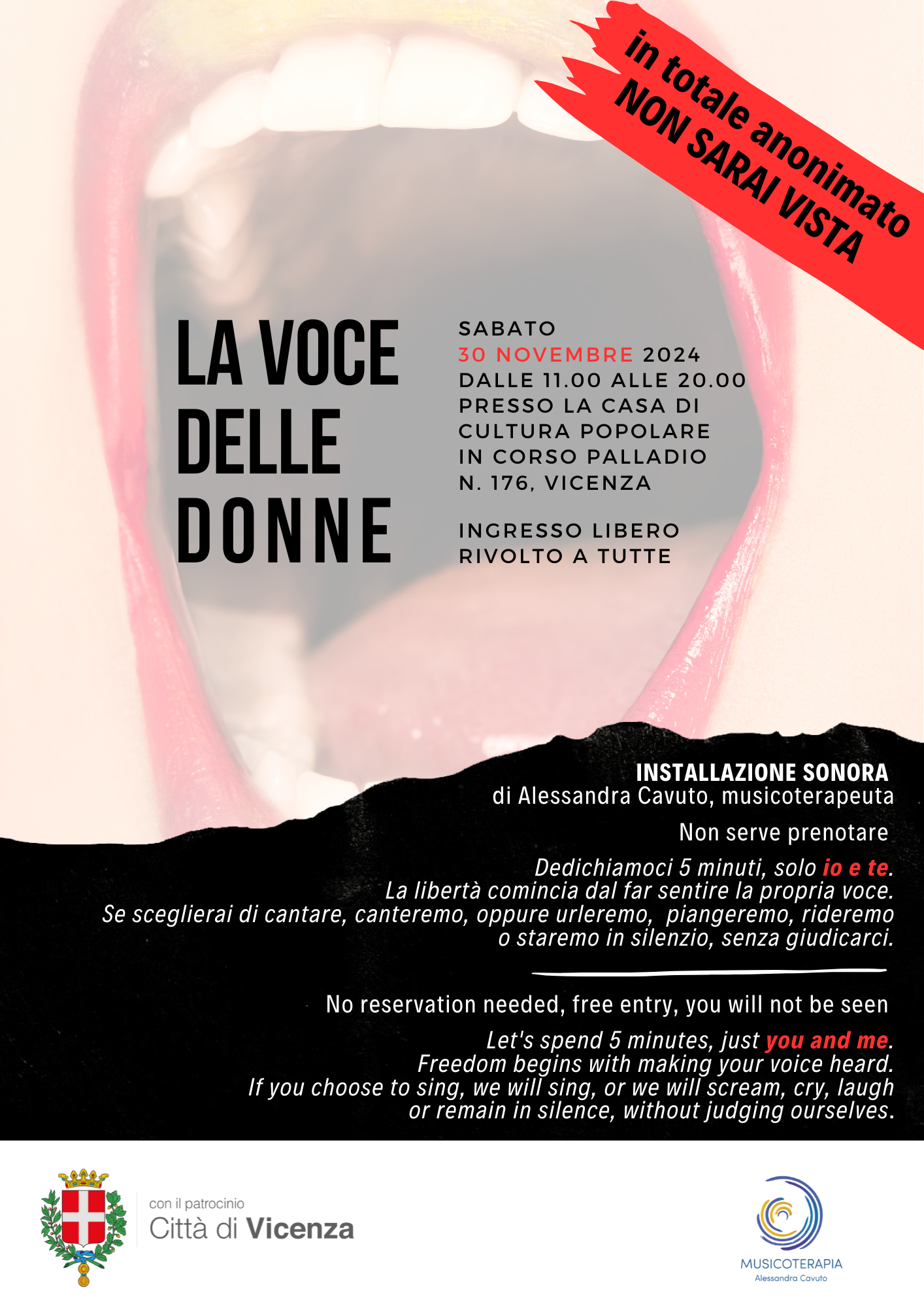 La libertà comincia dal far sentire la propria voce: "La Voce delle Donne" è un'installazione sonora aperta a tutte le donne e ragazze che desiderino liberare la propria voce. La musicoterapeuta Alessandra Cavuto vi riceverà, una alla volta, in totale anonimato e senza essere viste, supportando e condividendo ogni tipo di espressione vocale vogliate portare: un respiro, un suono, una canzone, una risata, un racconto, un pianto, il silenzio. La preparazione della professionista vi farà sentire accolte e libere di esprimervi, senza giudizio. Un’iniziativa originale che vuole abbattere molte barriere, fra cui anche quelle linguistiche.