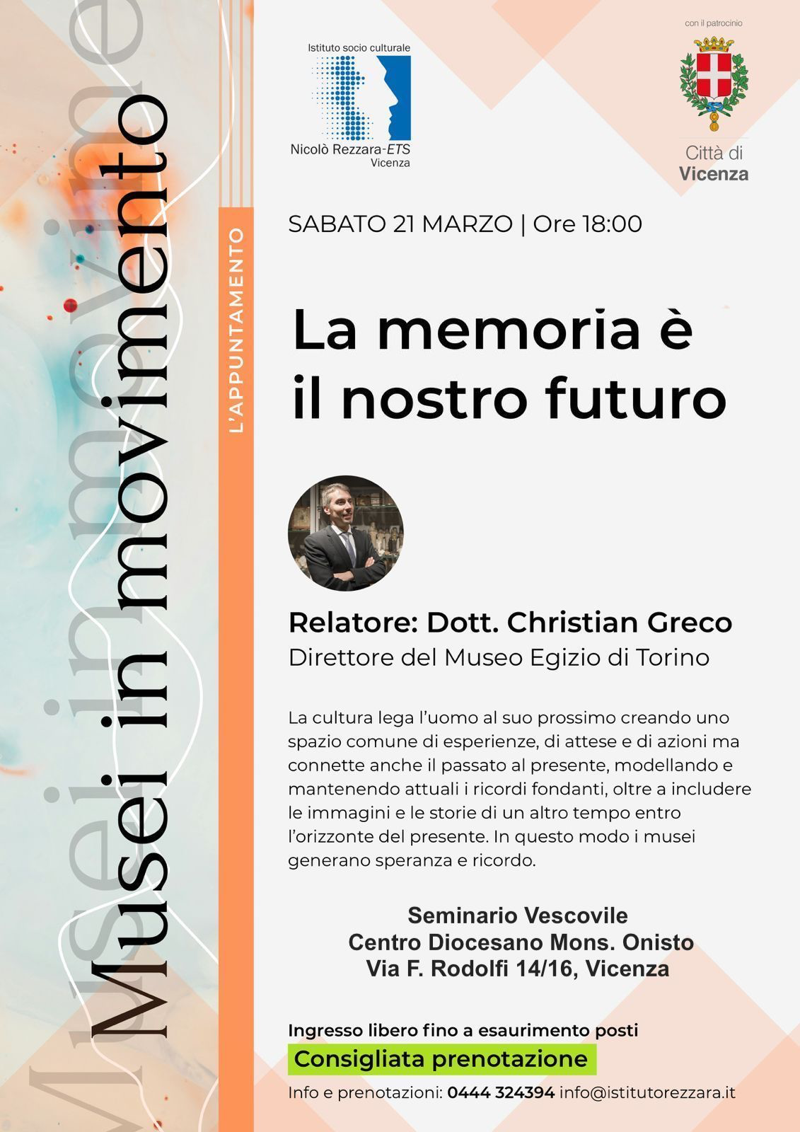 Sabato 21 marzo il dott. Christian Greco, direttore del Museo Egizio di Torino, tratta il tema "La memoria è il nostro futuro" presso il seminario Vescovile del Centro Diocesano Mons. Onisto. Ingresso libero fino ad esaurimento dei posti disponibili.